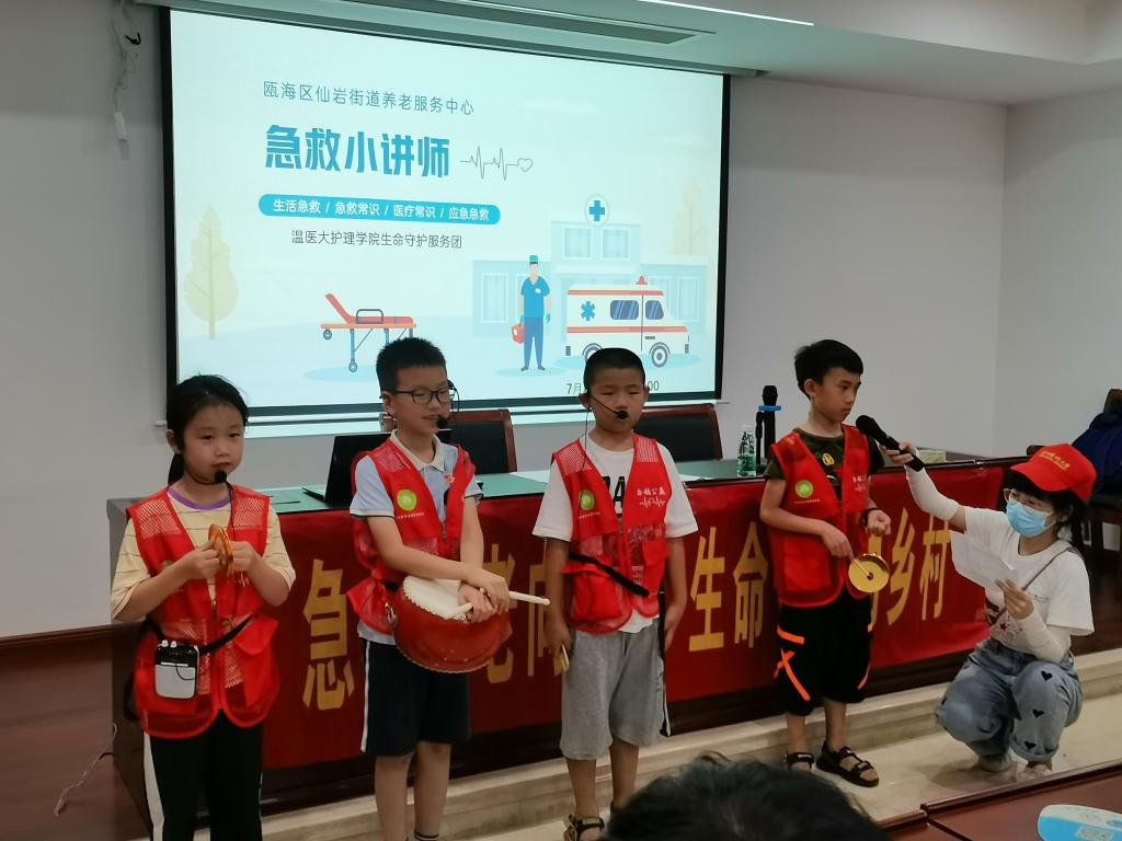 在为期12天的社会实践活动中,实践服务团在郭溪、仙岩和泰顺三魁镇党群服务中心,面向当地老年人开展急救公益讲堂,累计惠及200余人次。本次实践活动创新开展了“急救小讲师”活动,通过对小学生的选拔与培养,打造了一支以“急救三句半”形式进行急救普及的急救小讲师团。