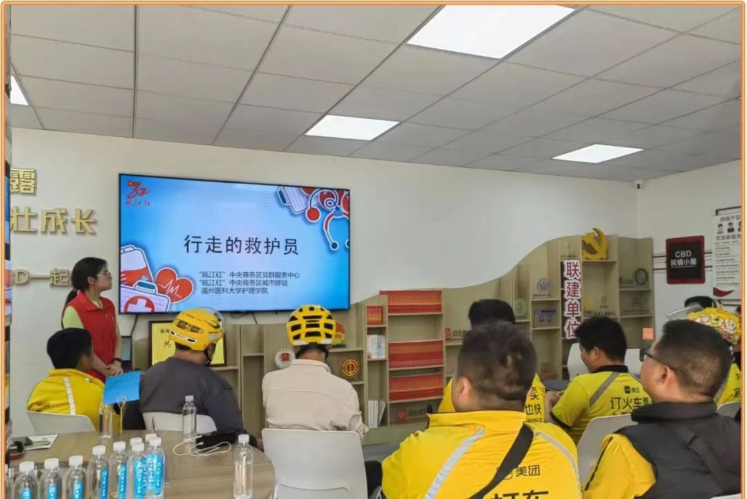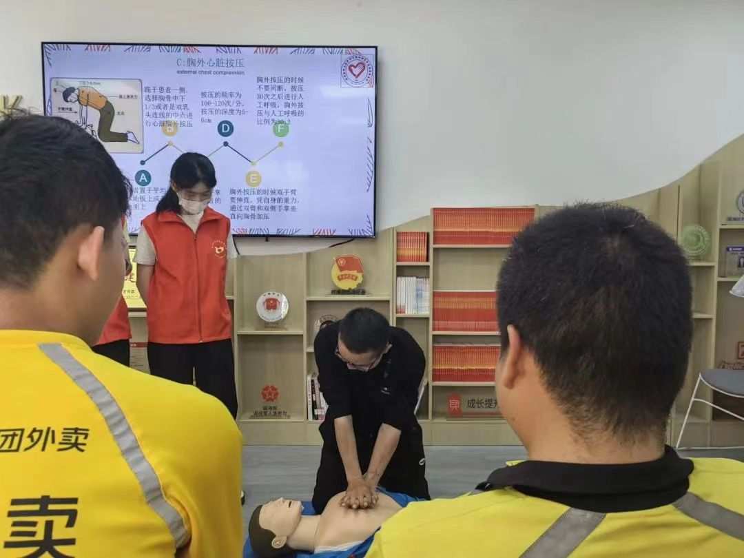 4月15日,海角社区 红十字搏时急救宣传志愿服务队在“瓯江红”商务区城市驿站开展了“急救骑士”培训活动,活动主要针对外卖员匆忙进食易导致呼吸道梗阻的现象和外卖员接触人群大的特点,围绕心脏骤停、心肺复苏术和海姆立克法三方面展开。其目的在于提高骑士们的急救意识,为“行走的救护员”的出现创造条件。