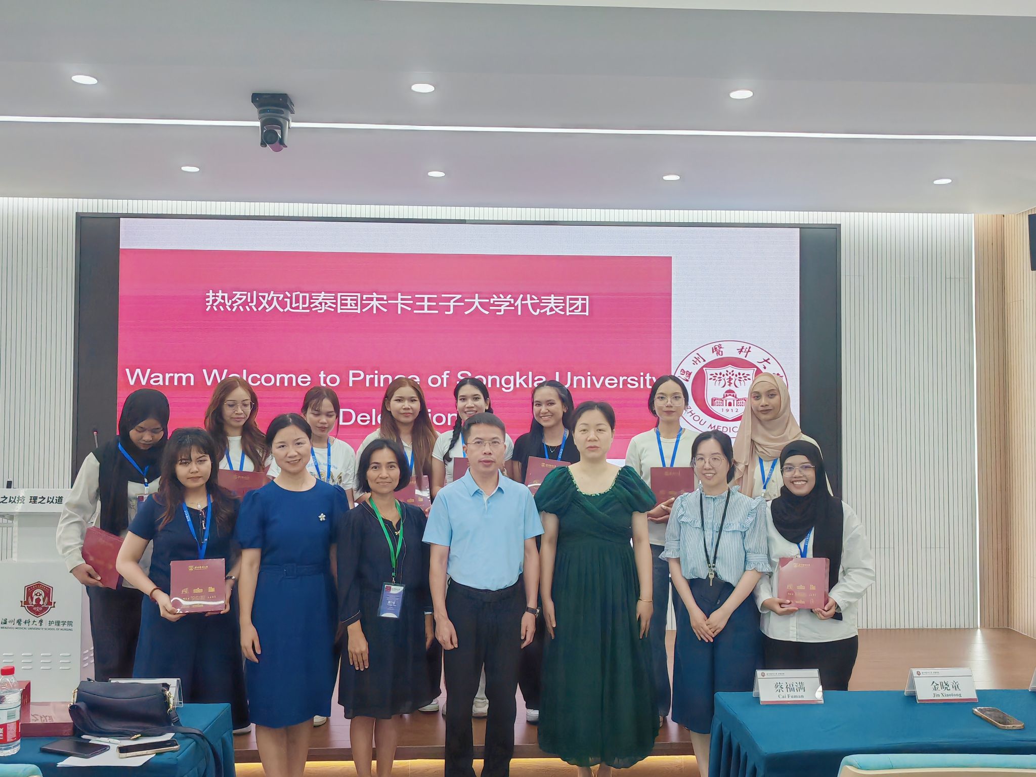 海角社区 院长蔡福满、党委副书记金晓童、副院长董超群以及学院教师及教学办出席欢迎仪式。蔡福满院长对泰国宋卡王子大学师生的到来表示热烈欢迎,并介绍学院在学科建设、人才培养、科研创新等方面的情况。他指出,此次交流是两校合作的重要里程碑,期待双方以此为契机,通过资源共享、联合培养、文化互鉴,共同构建国际化护理人才培养体系,为全球健康治理输送兼具专业素养与跨文化沟通能力的护理人才。学院领导分别向代表团赠送纪念品。双方就联合申报国际科研课题、开发跨国护理实训课程等深化合作的具体方向进行了富有成效的探讨,推动学术合作向纵深发展。