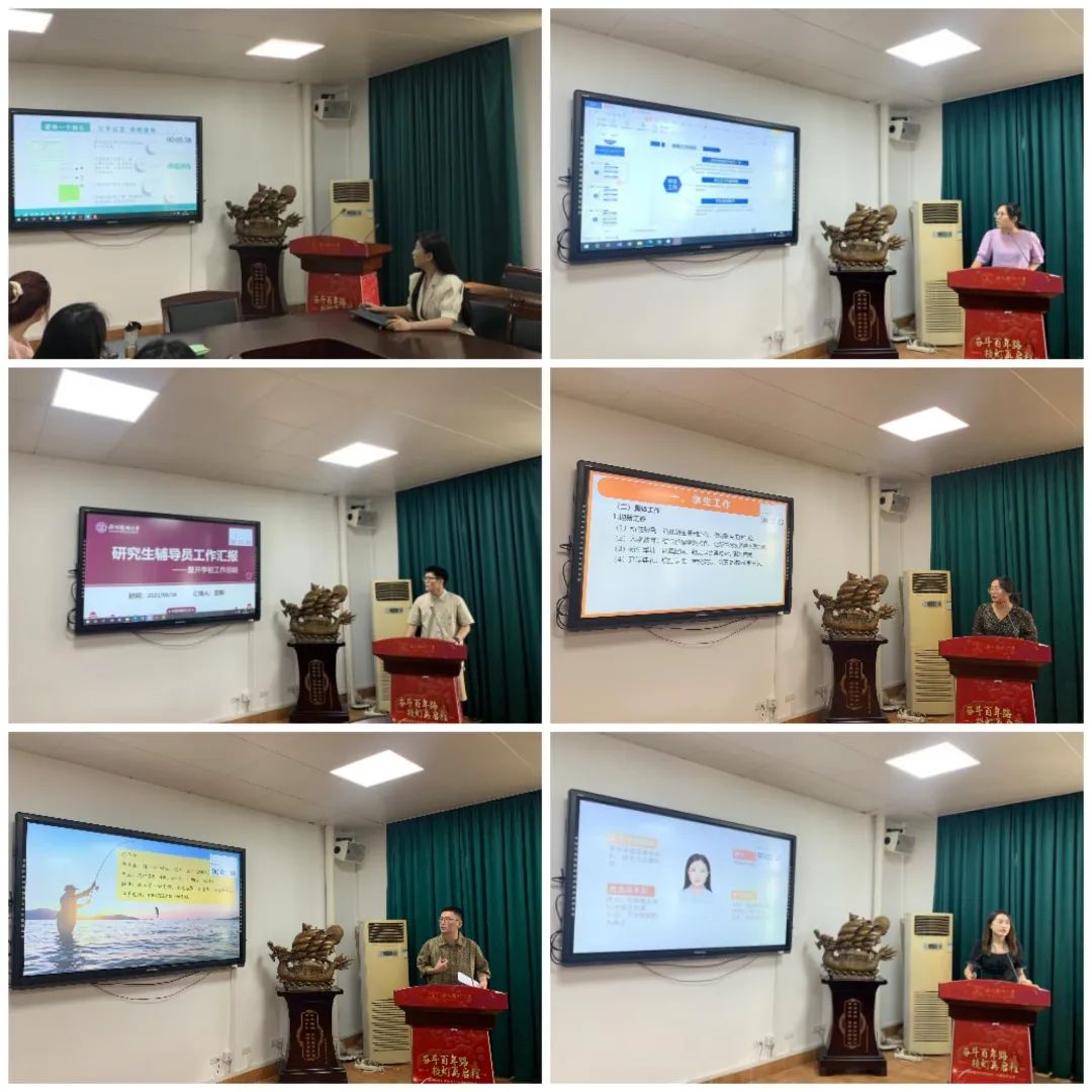 会上,各辅导员分别就暑期工作总结与开学初工作计划进行了汇报。陈素云副书记介绍了开学初各项工作安排,强调指出,各辅导员要明确分工做好工作规划,并共同助力做好学院迎新工作。重点谋划和布局学院团学和党建工作,抓好就业和考研两条线,动态关注特殊学生,确保学生安全稳定。