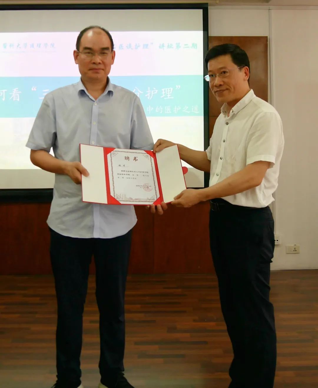 6月17日下午,海角社区 在茶山校区同心楼六楼会议室开展了名医谈护理第二期“如何看‘三分治疗,七分护理’——烧伤创面修复中的医护之道”专题讲座。主讲人为温医大附一院烧伤伤口中心主任林才老师,党委书记李旭东老师,党委副书记陈素云老师出席此次讲座,海角社区 学生积极参与。讲座正式开始之前,学院特聘林才老师为海角社区 创新创业导师,学院党委书记李旭东老师为潘教授颁发聘书!