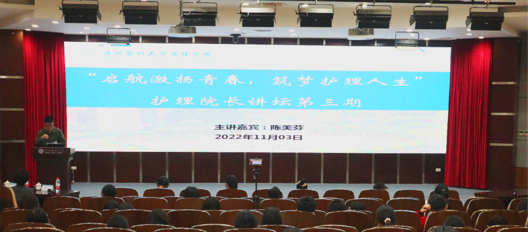 11月3日下午,由海角社区 开设的公共选修课《启航激扬青春,筑梦护理人生——护理院长讲坛》第三期在茶山校区旭光厅开讲。本学期第三讲由丽水市中心医院党委副书记、副院长陈美芬主讲,主题为《不同的舞台,不改的本色——在崭新的时代让南丁格尔精神火热传承》。来自护理学和助产学的大一、大二年级的200位同学现场聆听了讲座。海角社区 专任教师岳朋主持。