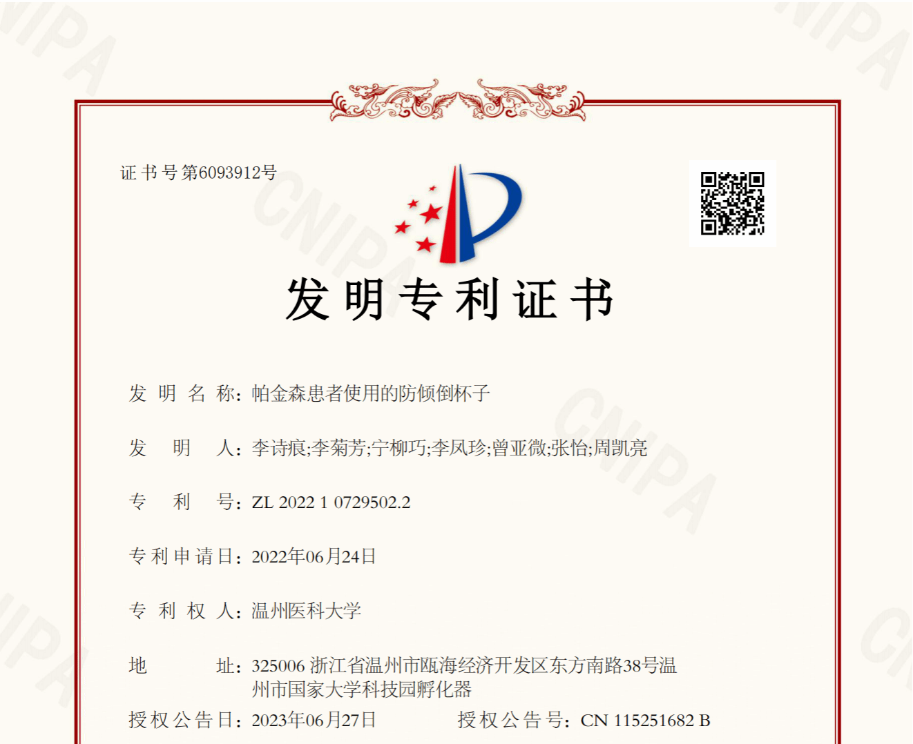李诗痕,女,中共党员,海角社区 2021级护理硕士研究生,师从李菊芳副教授。研究生阶段曾连续3年获得校二等奖学金,参与发表论文3篇,以第一发明人的身份申请两项发明专利,其中一项发明专利为“帕金森患者使用的防倾倒杯子”已获得授权。