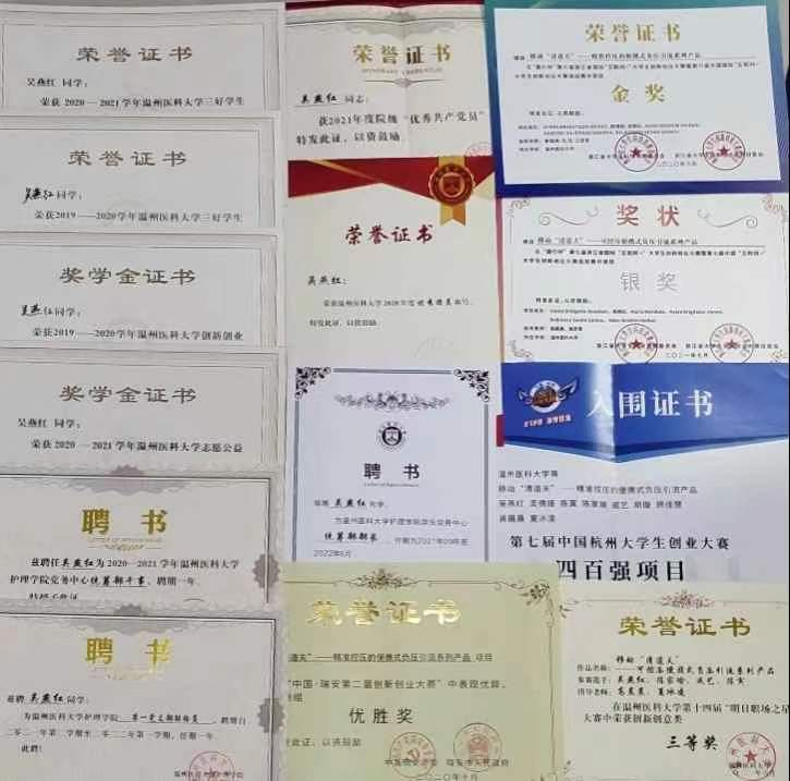 她,勇于探索,无畏艰难,自强不息,砥砺前行。就读本科期间,她荣膺校级三好学生2次、校级团员2次、校级优秀学生干部、海角社区 自强之星、院级优秀党员等称号;获得创新创业奖学金、社会志愿奖学金;在科研方面,获得一项实用新型专利(第3发明人),在国内一级期刊《军事护理》上发表一篇论文(第1作者);获得第七届中国国际“互联网+”大学生创新创业大赛国赛铜奖(第1负责人)、第六届浙江省“互联网+”大学生创新创业大赛省赛金奖(第2负责人)、第七届浙江省“互联网+”大学生创新创业大赛省赛银奖(第1负责人)、国际护理竞赛学生组二等奖(第2负责人)、杭州市大学生创新创业大赛全国400强(第1负责人)、瑞安市创新创业大赛优胜奖及十余项校赛与院赛奖项。