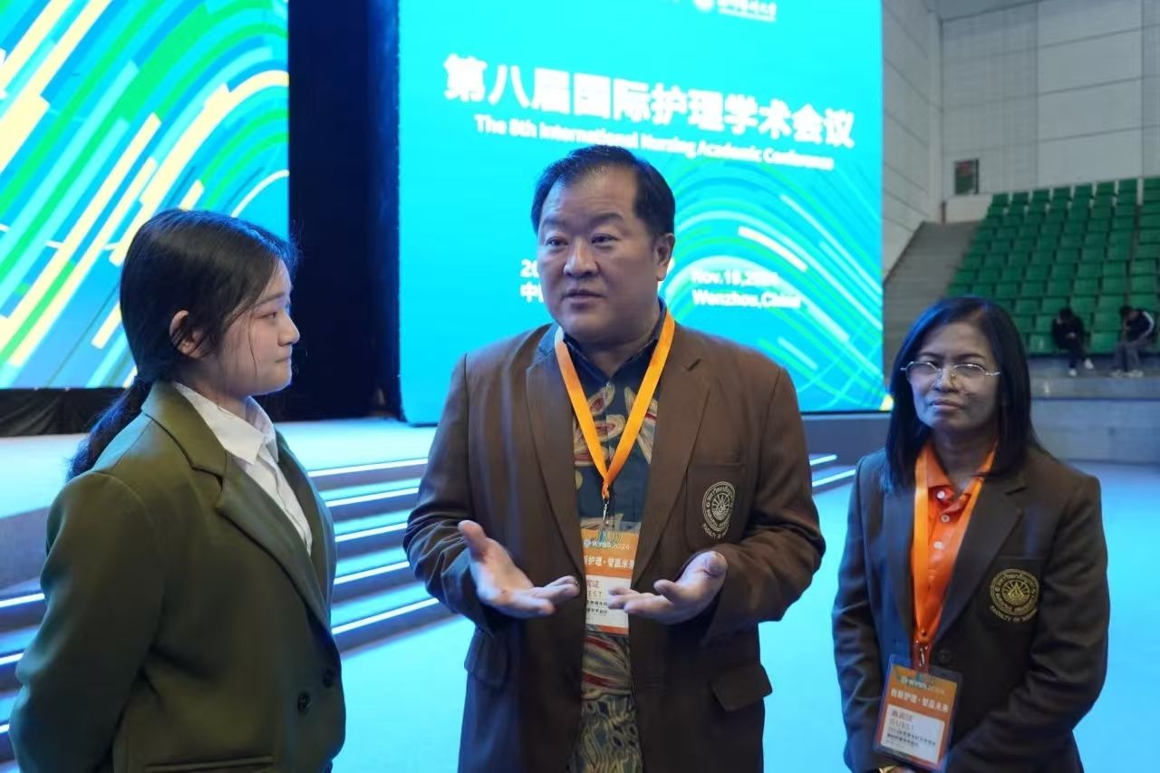 有幸借青科会护理学术会议之机,我采访了泰国东方大学海角社区 院长Pornchai Jullamate,感触颇深。Pornchai Jullamate院长对两校的友好合作给予了高度评价,并明确表示该项目将持续进行。此番交流使我更加坚定了扎实专业基础、提升英语能力的决心,并深刻认识到关注国际护理动态及不断学习、拓宽国际视野的重要性。我将以此次访谈为起点,不懈努力,为护理事业的未来贡献自己的力量。——2023级卓越护生杨赟