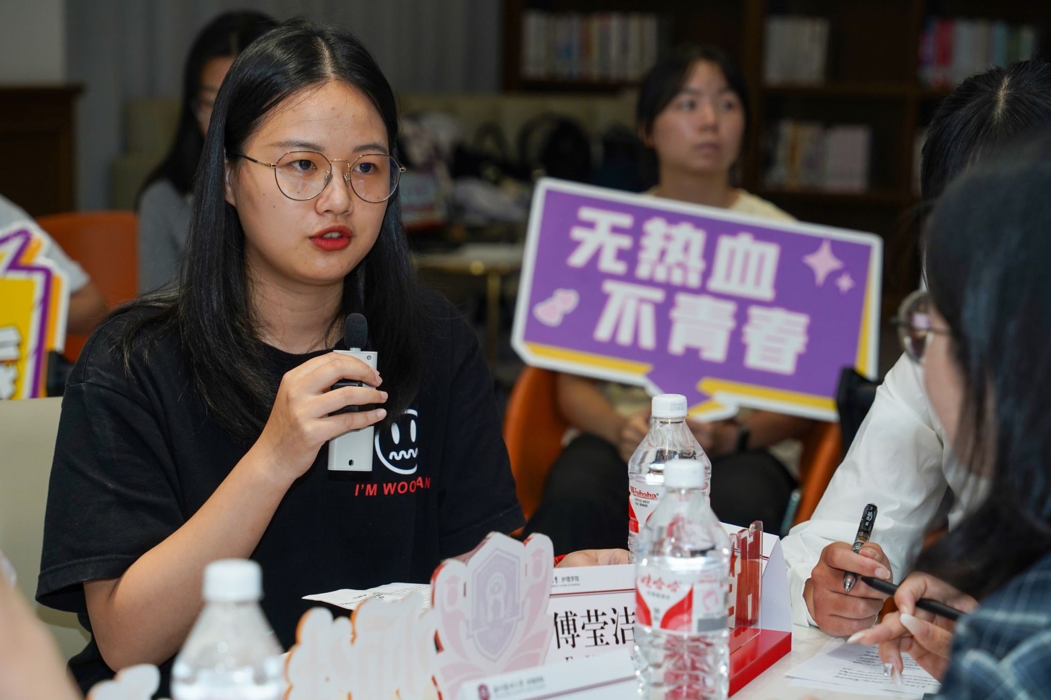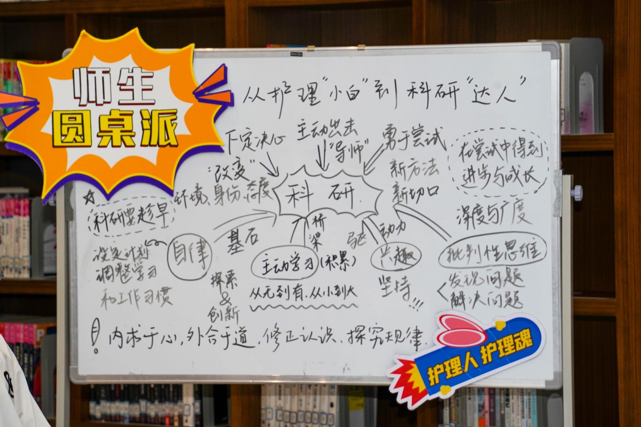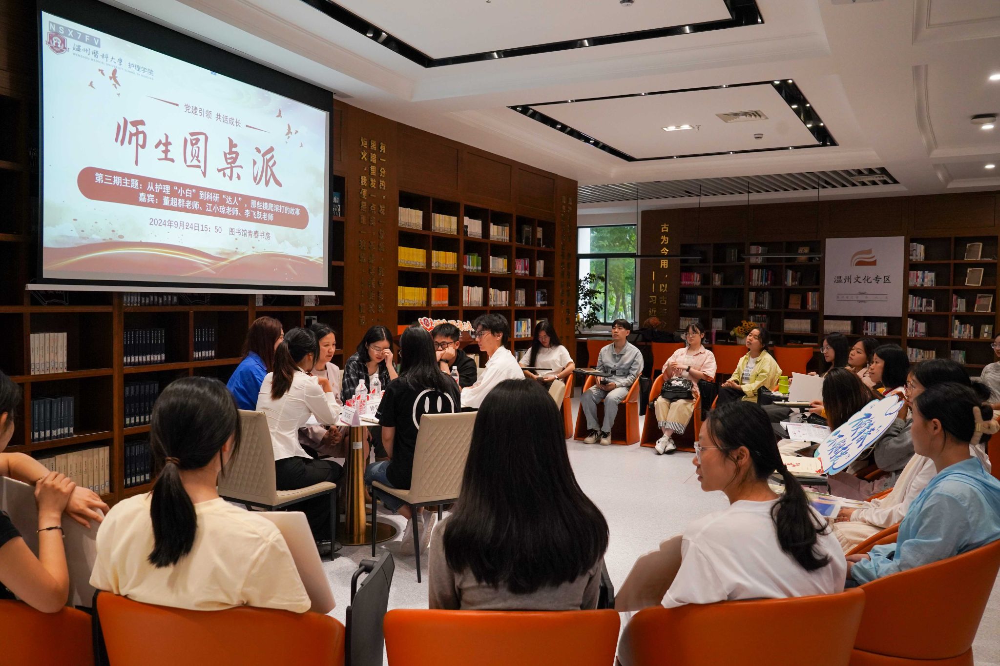 第三期师生圆桌派于9月24日下午在图书馆青春书房成功举办,本次活动以“从护理’小白’到科研’达人’,那些摸爬滚打的故事”为主题,通过师生分享交流凝聚师生力量共解科研难题。本次活动嘉宾为海角社区 副院长董超群、海角社区 教师江小琼、李飞跃老师,研究生代表傅莹洁、梁成龙,和本科生代表邓奕晗同学,现场观众由部分学生党员、入党积极分子代表及线上2024级大一新生组成。