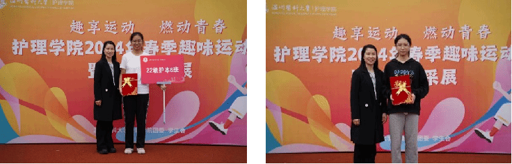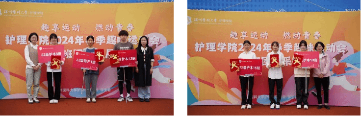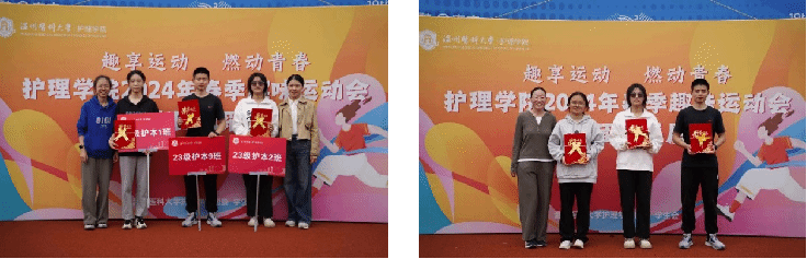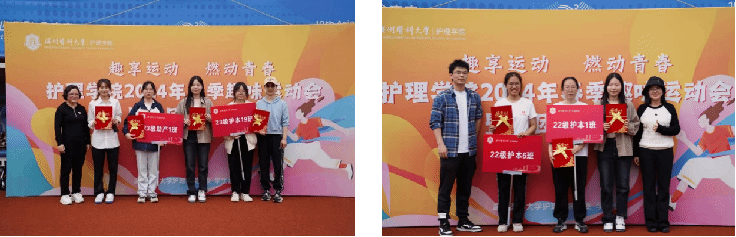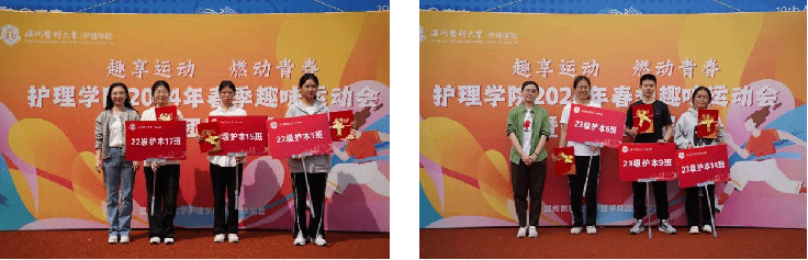 经过激烈角逐,22护本6班和23护本1班在众多班级团体中脱颖而出,荣获团体奖第一名,23护本14班和23护本1班凭借强大凝聚力和意志力分别获得了旱地龙舟和传球接力的第一名,23护本18班也以默契的配合斩获长绳单项第一,23 护本6班凭借顽强的毅力获得了拔河单项第一。