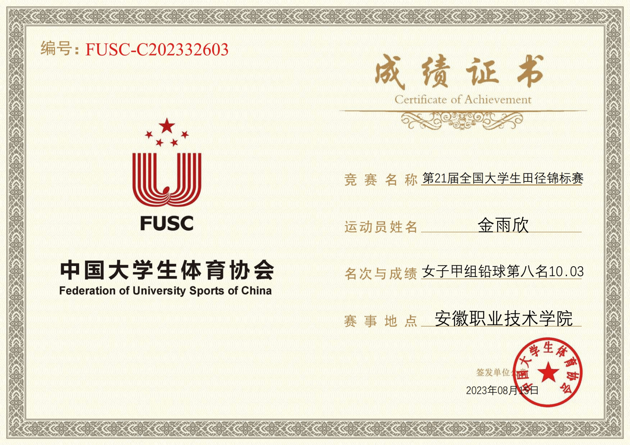 2023年8月10日—16日,海角社区 健儿金雨欣同学(校田径队员)参加由中国大学生体育协会主办的第21届全国大学生田径锦标赛中,她顽强拼搏,最终以10.03米的成绩取得第八名,创造我校田径历史。全国田径锦标赛成绩是评价高校体育工作的一项重要指标。