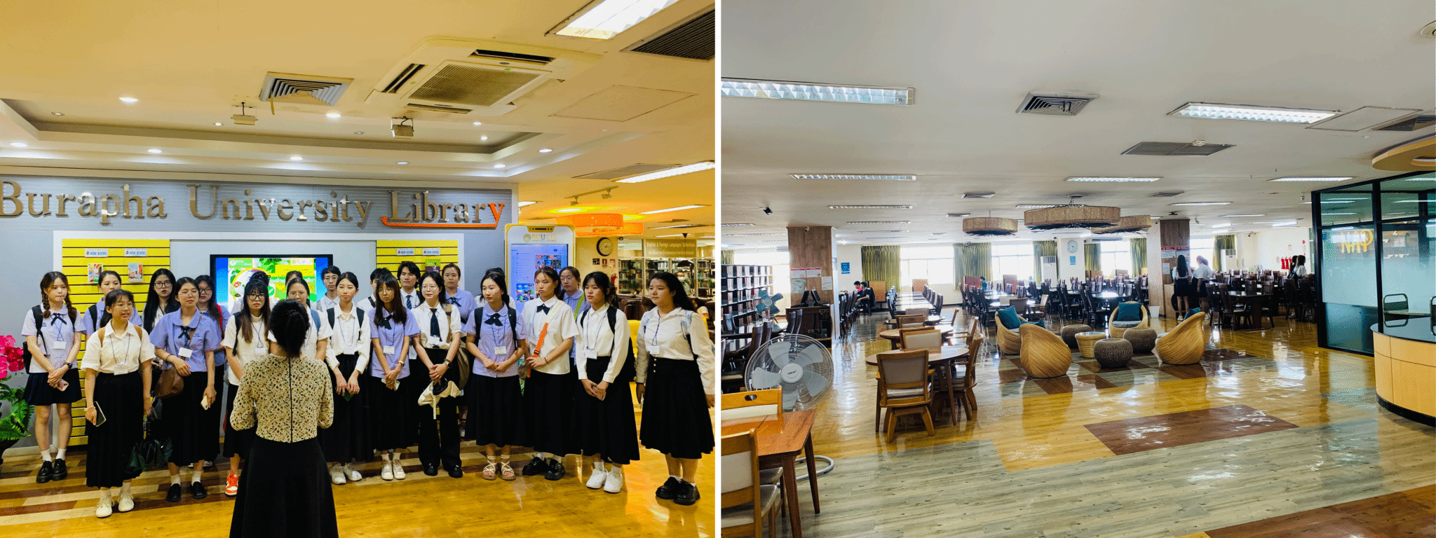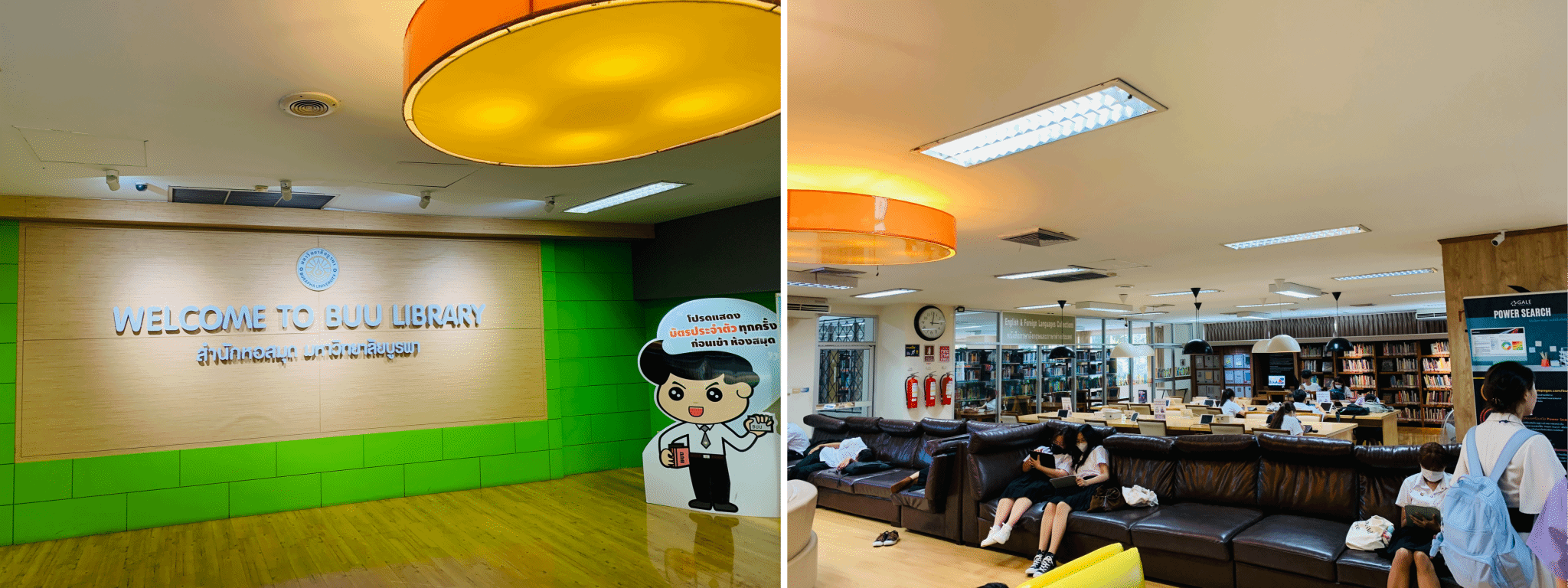 Dr.Rungnapa 带我们参观了Buu central Library,图书馆共设有六层,内部整洁安静、书籍种类丰富,除设置学习区外,还设有“sTv”“ karaoke”“quiet zone”等娱乐区,让学生在繁忙之余放松身心。