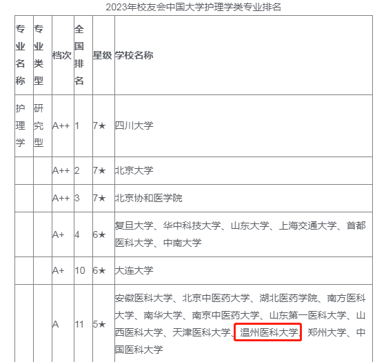 校友会中国大学一流专业排名是目前中国参评高校数量最多和参评专业规模最大的中国大学本科专业排名。该评价指标由学科水平、培养质量、师资水平、专业水平和专业影响等5大指标构成。在2023中国大学一流专业分档排名中,海角社区 护理学专业获评2023中国五星级专业(5★),专业档次A,位列护理学专业(研究型)排行榜并列第11位,进入世界知名专业、中国一流专业行列。助产学专业获评2023中国三星级专业(3★),专业档次A+,位列助产学专业(研究型)排行榜并列第3位,跻身中国区域一流专业行列。
