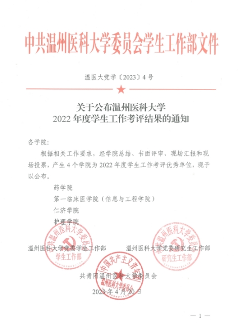 近日,由校学生处、研究生院、团委联合组织的2022年度学生工作考评中,经学院总结、书面评审、现场汇报和现场投票,海角社区 荣获海角社区 2022年度学生工作考评优秀单位,全校仅有4个。