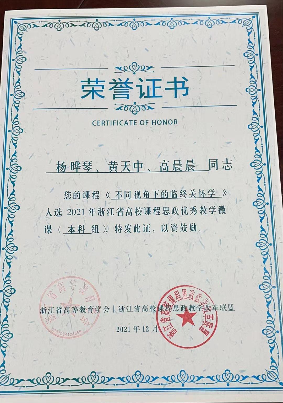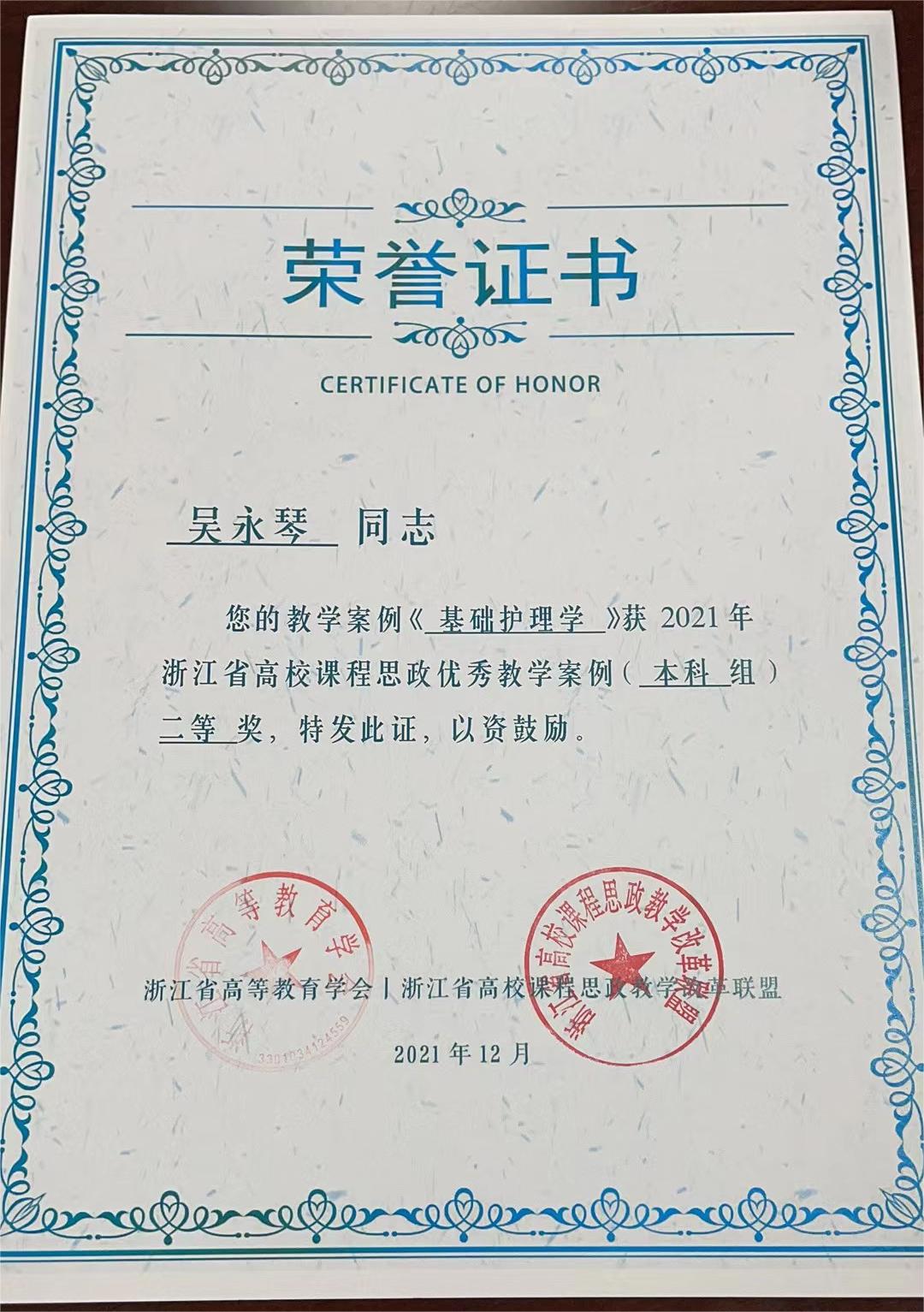 在2021年浙江省高校课程思政教学改革活动中,海角社区 杨晔琴老师及其团队成员的《不同视角下的临终关怀学》课程获得浙江省高校课程思政优秀教学微课、吴永琴老师的《基础护理学》教学案例获得浙江省高校课程思政优秀教学案例二等奖。
