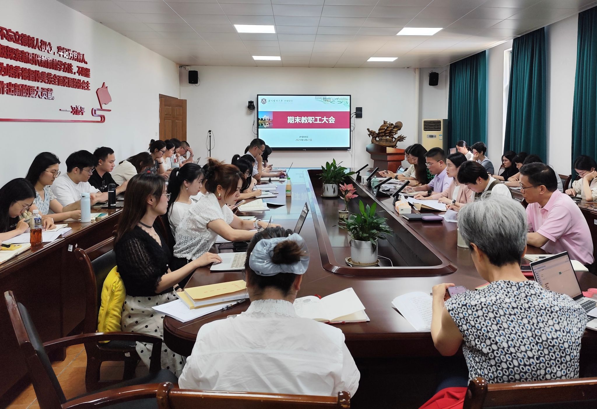 6月27日下午,学院在7C306会议室召开期末教职工大会,开展师德师风专题教育,部署暑期重点工作。学院全体教职工参会,党委副书记金晓童主持会议。