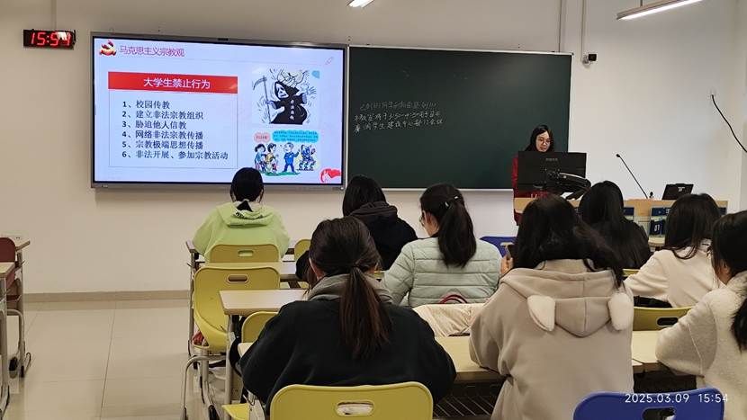 首先,邹奕瑄部长为大家讲述了马克思主义宗教教育的相关内容。从非法宗教行为,到大学生禁止行为,她讲述了如何树立正确的宗教观,以及非法宗教行为带来的一系列危害。