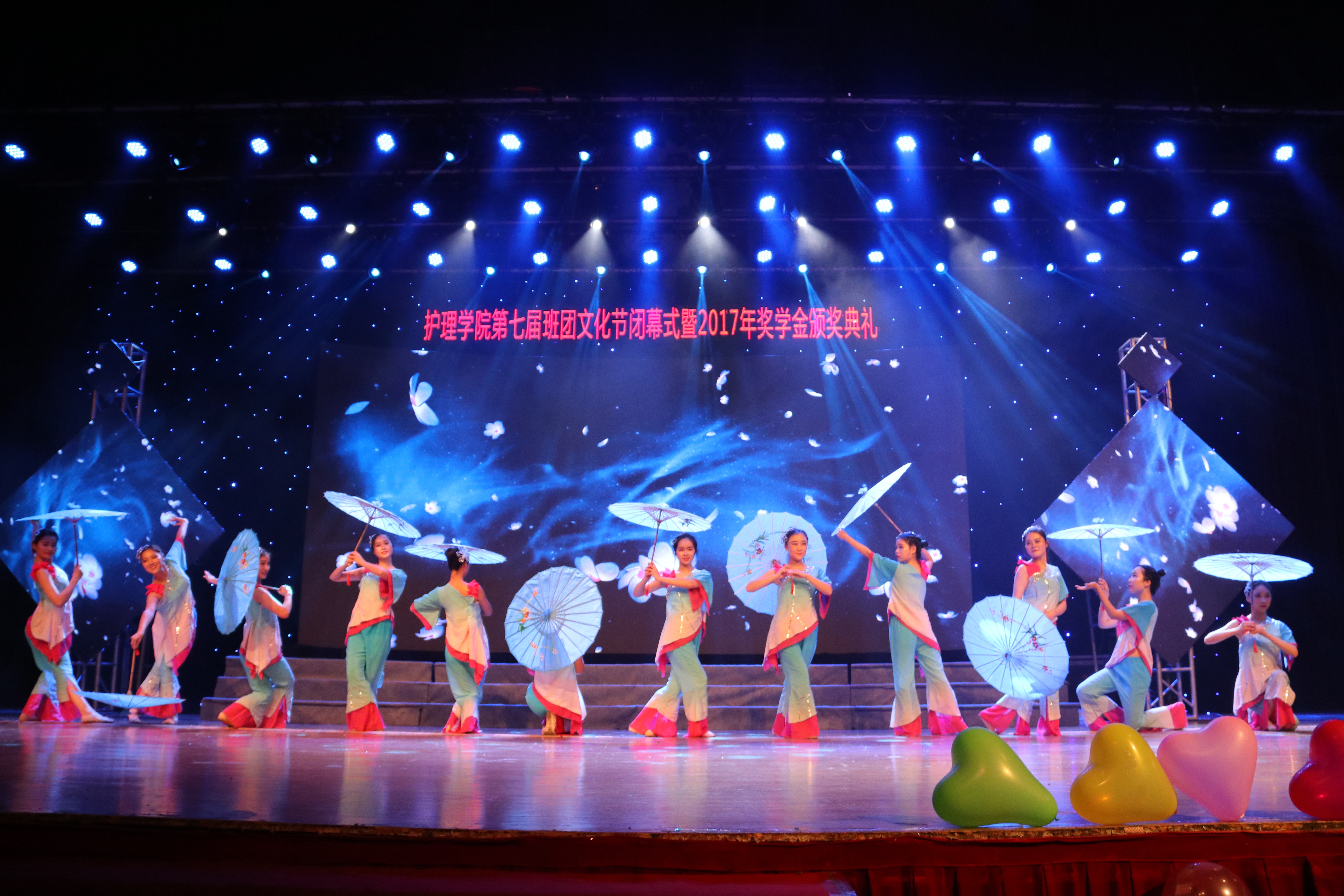 灯光音响就位,本次闭幕式在海角社区 女子合唱团绕梁的歌声中拉开序幕,悠扬的《走进新时代》仿佛将华夏儿女坚定的文化自信娓娓道来。一曲结束,随着缓缓落下的一束灯光出现的是一袭青裾长裙飘飘欲仙,油纸伞下的豆蔻女子袅袅而行,由海角社区 民舞队带来的舞蹈《丽人行韵》充分展示了古典舞不骄不躁,不张扬不平庸的美。酷炫的灯光,动感的音乐,灵动的舞姿,街舞《Missile》用动感的舞步奏响起青春的乐章。街舞和民族舞两个舞种相互碰撞,各有千秋,但都用年轻的节拍诠释了青春澎湃的活力。慷慨激昂的诗朗诵《青春之歌》,情景剧《海阔天空》中熟悉的背景音乐,以及平时在讲台一丝不苟,认真严谨的海角社区 老师们难得一见的一展歌喉更是一次次将现场气氛带到了高潮。最后,院十佳歌手们的倾情演唱的歌曲串烧《我们的小小时代》点燃了全场,所有人一起在歌声中展望美好的明天,放飞青春的梦想。