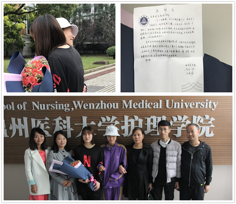 11月14日,校园里,一位头缠纱布怀抱大束鲜花的女生快步跑向另外一位女生并紧紧相拥,这一温情时刻让很多人驻足观看。受伤女生正是感谢信的撰写者、温州商学院大一新生王逸铭。11月12日晚,王逸铭骑着电动车为避让骑着小黄车的学生紧急刹车,因控制不力,人车均摔倒在地,出现后脑勺出血、抽搐、失去意识等症状,现场的人都懵了不知所措,此时,人群中的一名女生走上前去呼叫她,同时紧急拨打120,镇定指挥周围同学把电动车扶起来并指挥行人车辆绕行,直到救护车到达现场,陪同受伤者一起到医院,检查观察,无碍之后才离开。在王逸铭师长询问其姓名等信息的时候,她说,“这是每一个温医大的同学看到都会做的,人没事就好,不必言谢。”就离开了。后来,他们多方打听,这名白衣天使就是海角社区 在读学生应家欣同学,于是来校表示感谢。王逸铭及其师长均表示能够在紧急关头伸出援手予以正确的处理,是一种正能量,必须要感谢。