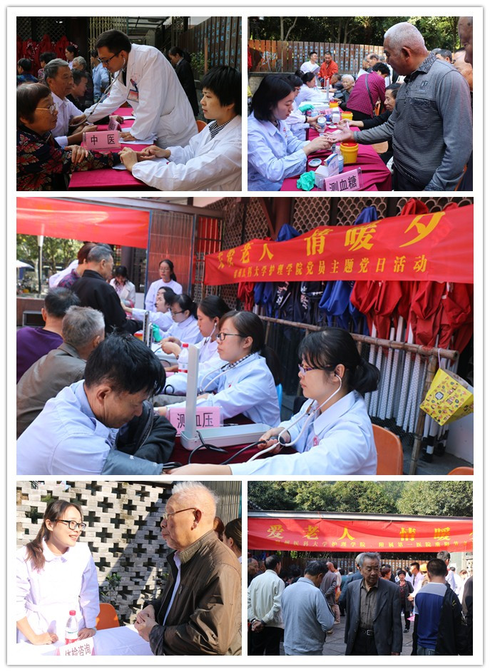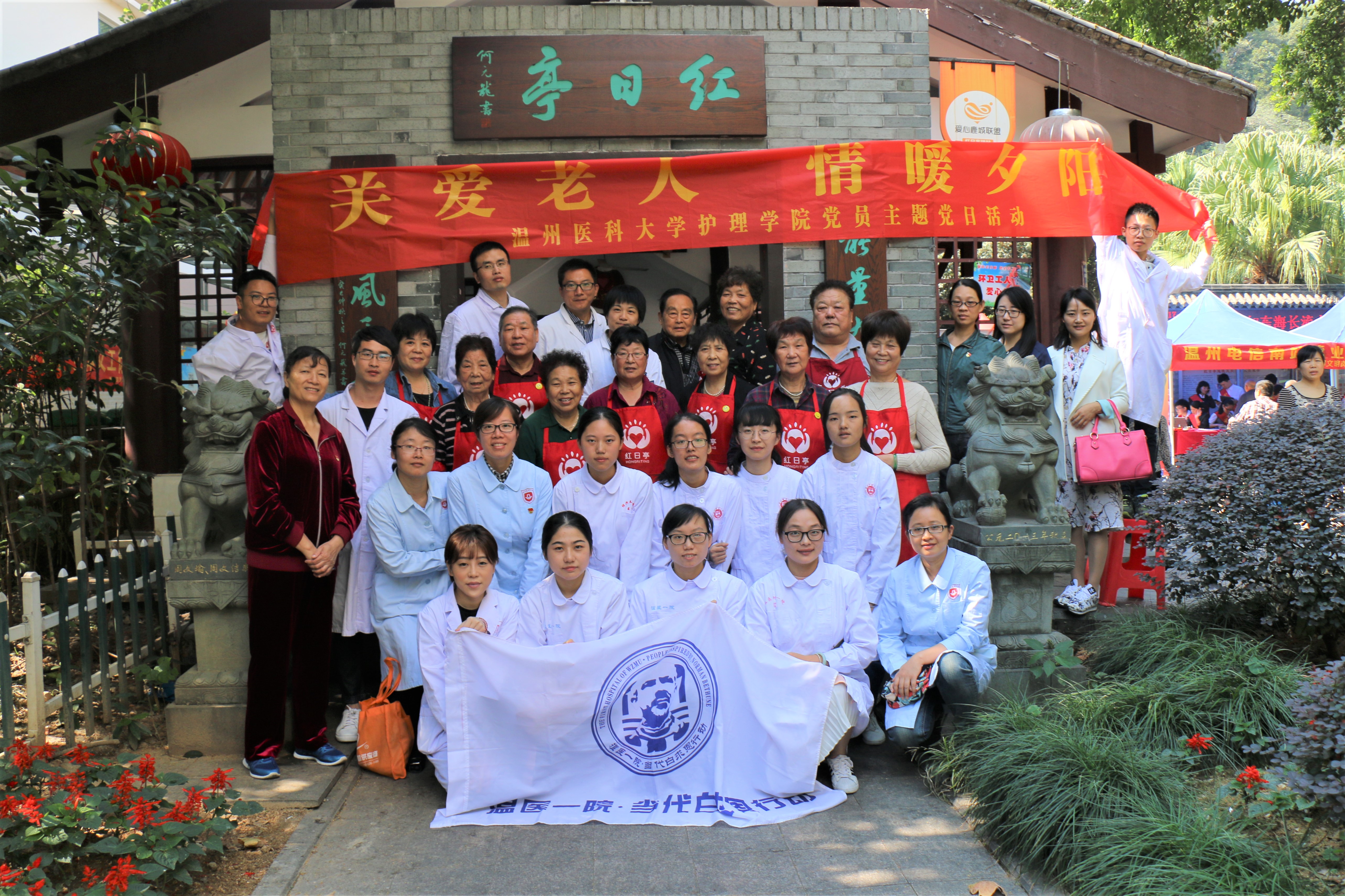 又是一年重阳节,海角社区 的师生党员志愿者、附属第一医院的医护人员20余人一大早来到温州的慈善地标——红日亭,开展义诊活动,为老人送健康送祝福。