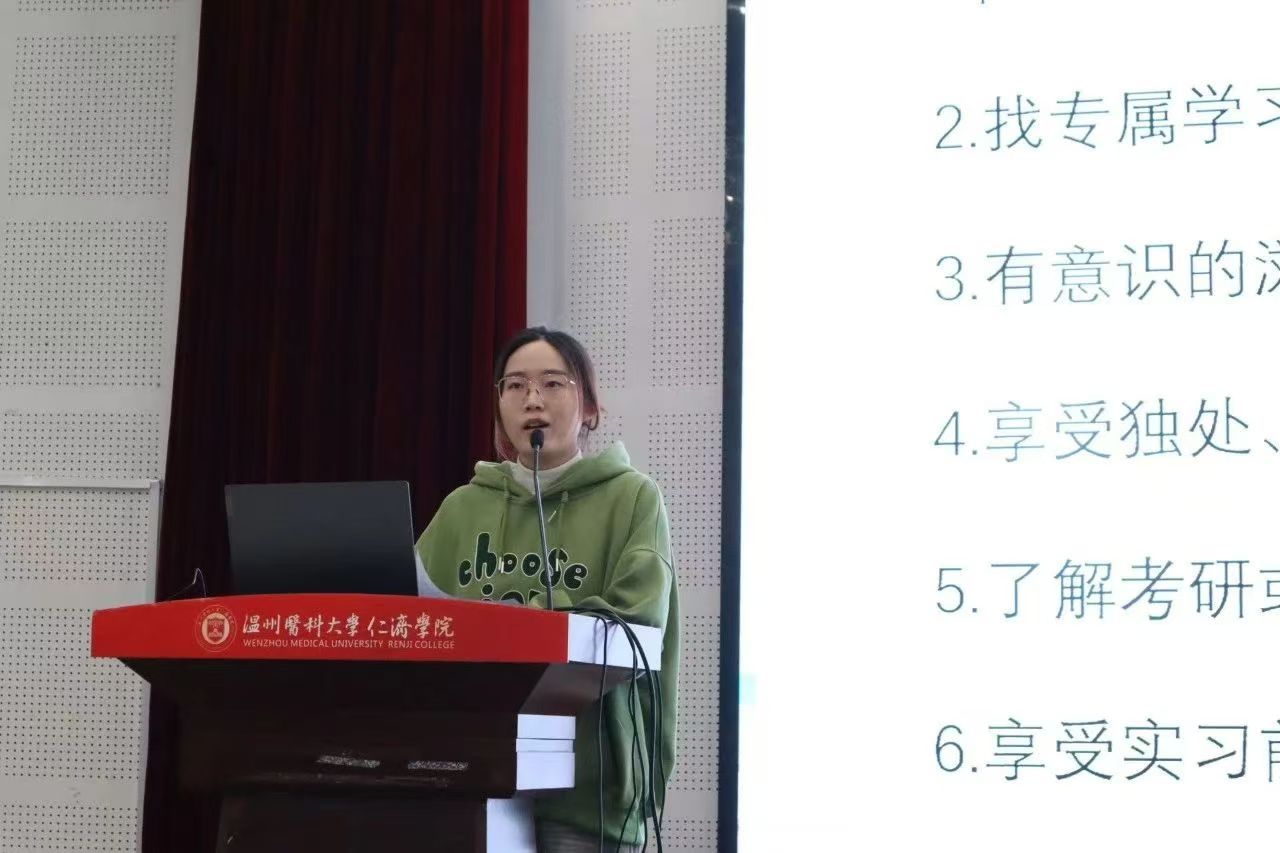 钱锦颖同学则以“医路向前,传递星火”为主题,分享了她两年半的大学生活规划和经验。她将大学生活分为三个阶段,并针对性地提出了建议:大一阶段是探索大学生活的关键时期,要积极参与社团活动,提升自身能力;大二阶段是参与科研竞赛的黄金时期,要积极发掘自身特长,提升科研能力;大三和大四阶段是冲刺和准备阶段,要提升绩点,为未来做好准备。此外,她还强调了自我管理、有效社交和情绪管理等方面的重要性,建议同学们积极建立有效社交关系,并找到适合自己解压方式。