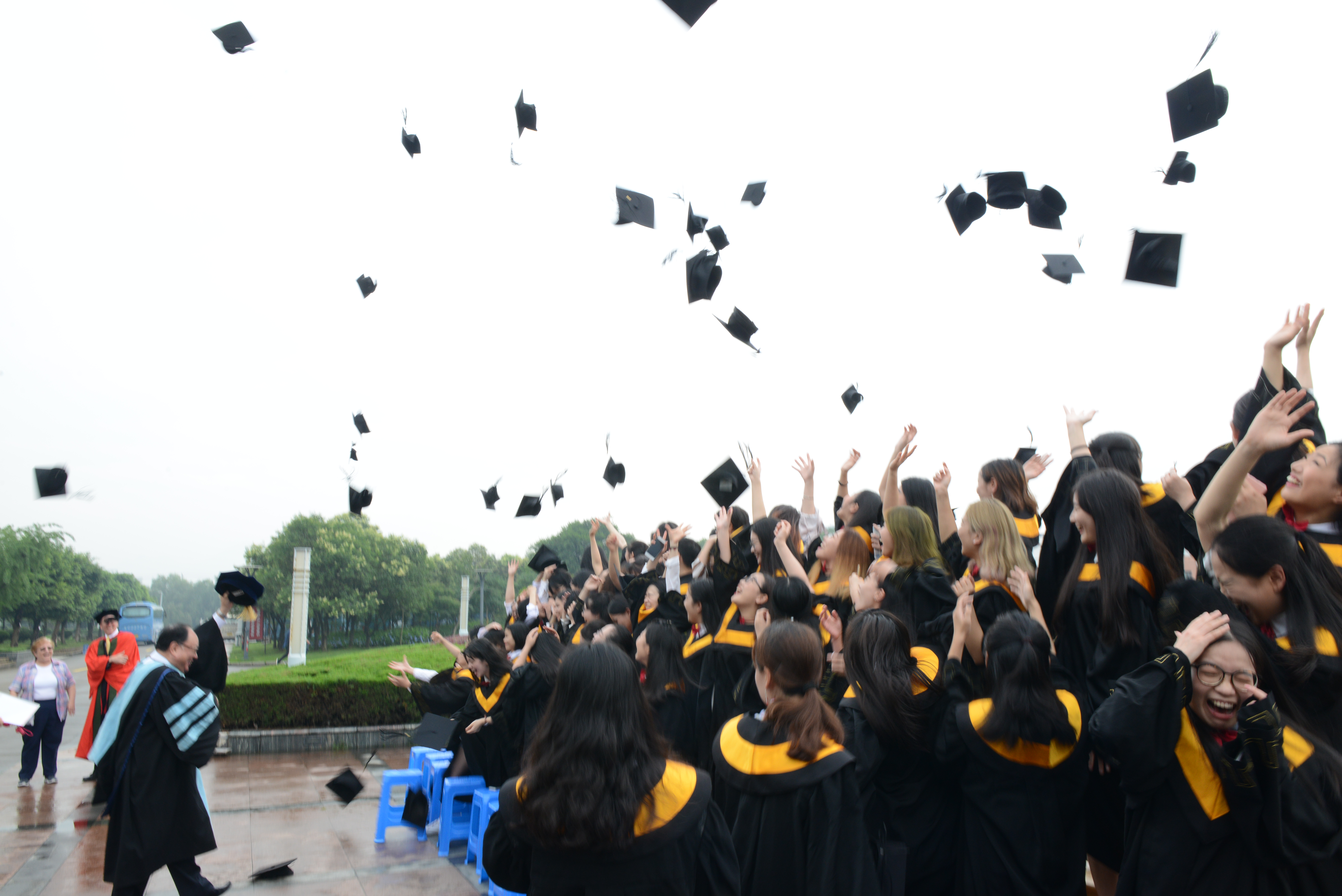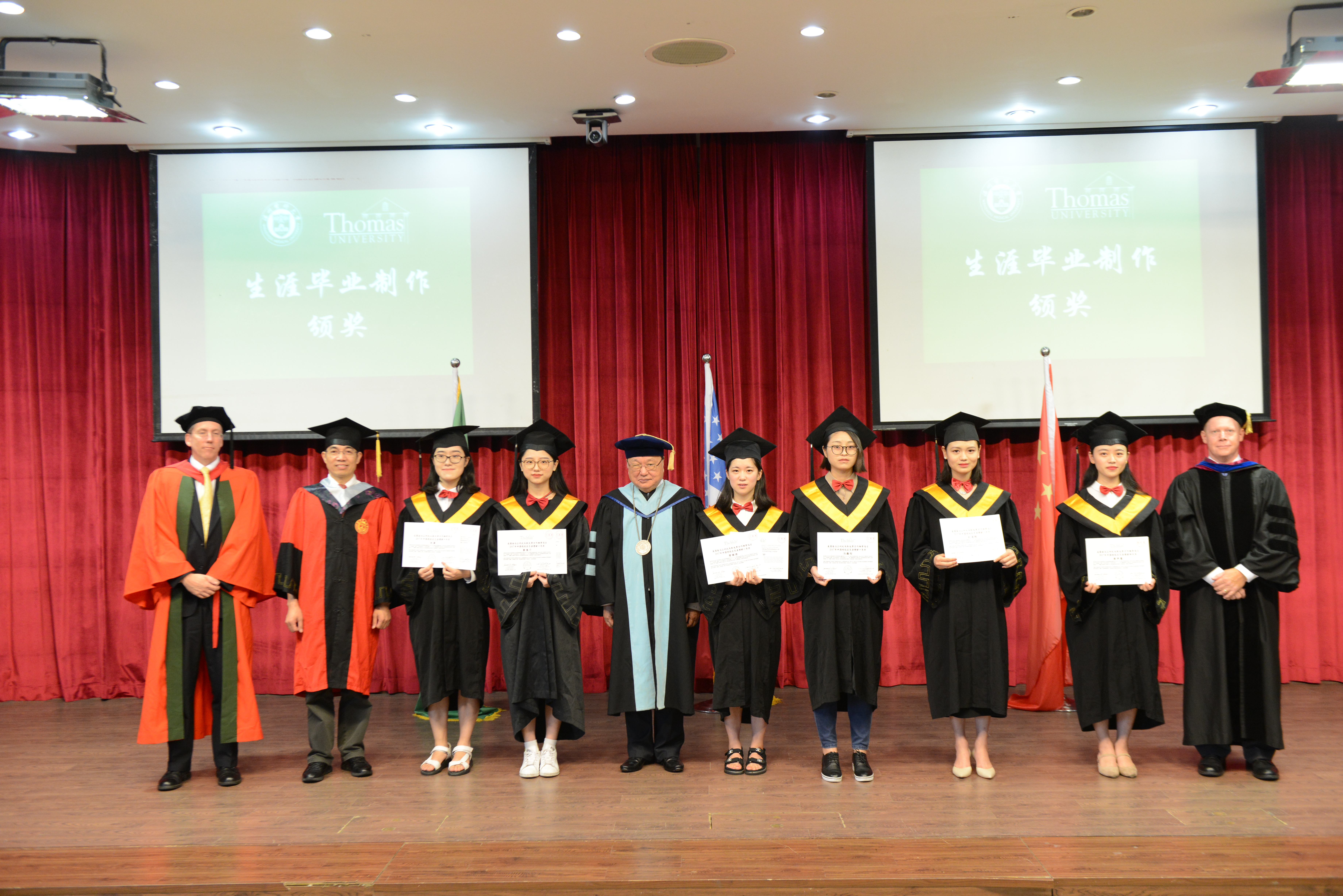 58位毕业生依次上台接受谢普德的拨穗,并接过曹建明颁发的学位证书。观礼师生、家长用热烈的掌声为每一位毕业生送上最真挚的祝福。在新征程即将启幕之际,毕业生代表们向托马斯大学校方代表献花,表达感谢之情。