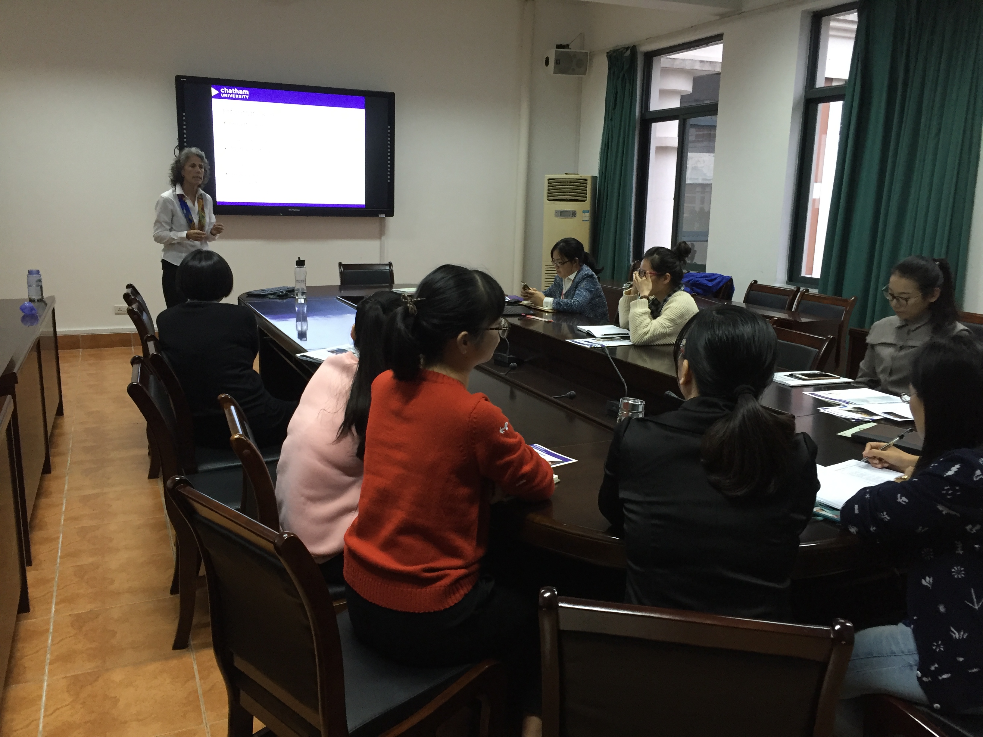 11月8日,美国Chatham大学海角社区 Debra Wolf博士来访海角社区 。院长卢中秋、副院长杨晔琴以及各教研室主任、相关专业课教师在7C306会议室与Wolf博士进行了交流。