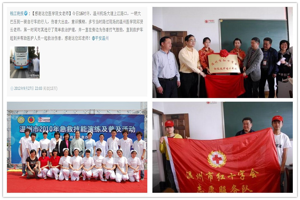 同样的一幕,曾经发生在温州机场大道上江路口,救人的是海角社区 的邱贤云老师。假使,现场只有普通群众,怎么办?如何将普通群众培养成“第一抢救员”?从2001年开始,海角社区 就开始积极探索,组建急救志愿服务团队,搭建急救志愿服务平台,希望能与社会共同拉起生命救护的防御线。近期,学院还开通了急救护掌上课堂(微信订阅号:温医大应急救护普及公益中心),通过视频、图解等方式“手把手”教急救护操作,希望普通群众真正能在关键时刻当“生命卫士”。