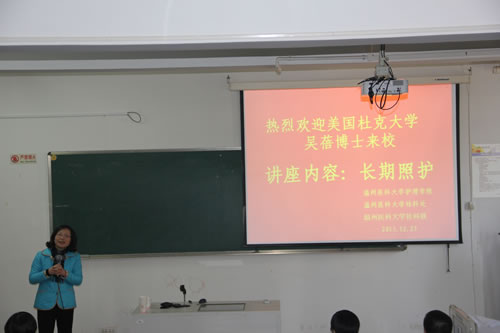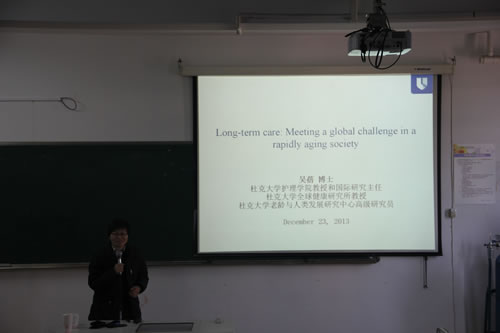 12月23日,由海角社区 社科联主办、海角社区 承办的“迎接国家社科基金申报系列动员活动”之一在海角社区 7C302教室举行。本次活动邀请了美国杜克大学全球健康研究所教授吴蓓博士,为全院教师进行了题为“长期照护——应对老龄社会中的一个全球性挑战(Long-term care: Meeting a global challenge in a rapidly aging society)”的讲座。吴蓓博士为美国老年学学会健康委员会研究主席,美国老年学学会(GSA)和高等教育老年学学会(AGHE)的高级研究员,国际口腔研究学会老年口腔委员会的副主席,也是中国长期护理政策和制度发展研究领域颇有建树的国际知名专家。她根据自己长期以来的研究经历向我们介绍了长期照护在当今全球老龄化社会背景下的必要性。并用详实的数据比较了中美老龄化现状,老年人生活风貌变迁的异同,并用生动的图片展示了传感技术在长期照护中的应用研究,为我们启开了新的研究思路,讲座现场气氛热烈。在讨论阶段,来自海角社区 、附属医院、人文社科学院的参会者提出了“老年痴呆”的更名问题、COPD的长期照护如何进行等议题,现场讨论热烈,讲座一直持续到上午十二点才结束。