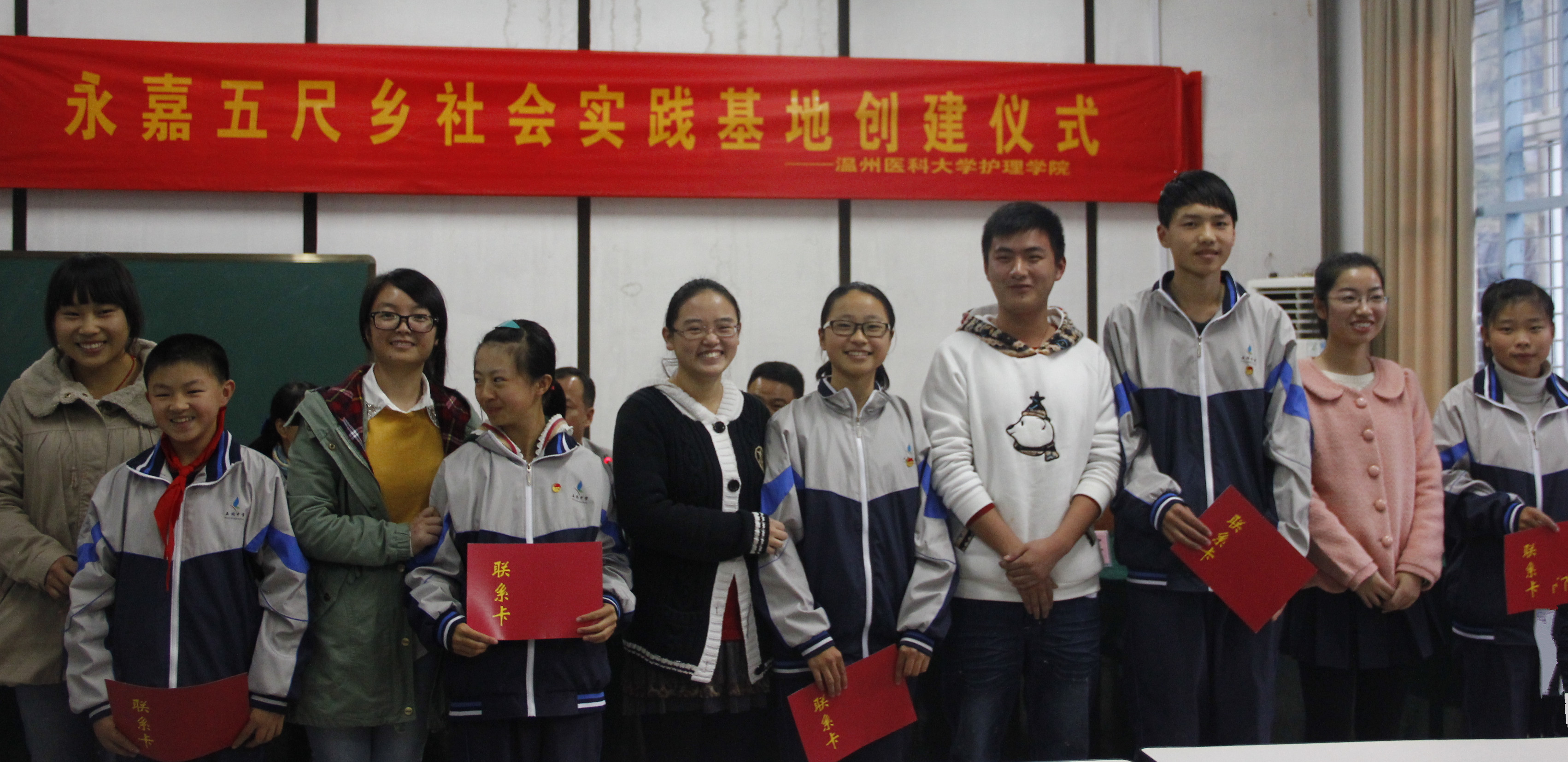 今年暑假,我校海角社区 暑期社会实践队在永嘉五尺社区开展暑期社会实践活动,得到了当地政府和群众的欢迎,并荣获“温州市优秀暑期社会实践队伍”的称号。据了解,永嘉五尺社区居民多为留守儿童与空巢老人,为了继续深入服务永嘉山区的父老乡亲,延续护理学子的公益之心,发扬温医学子济世爱民的精神,海角社区 与五尺中学达成协议创建长期的社会实践基地。