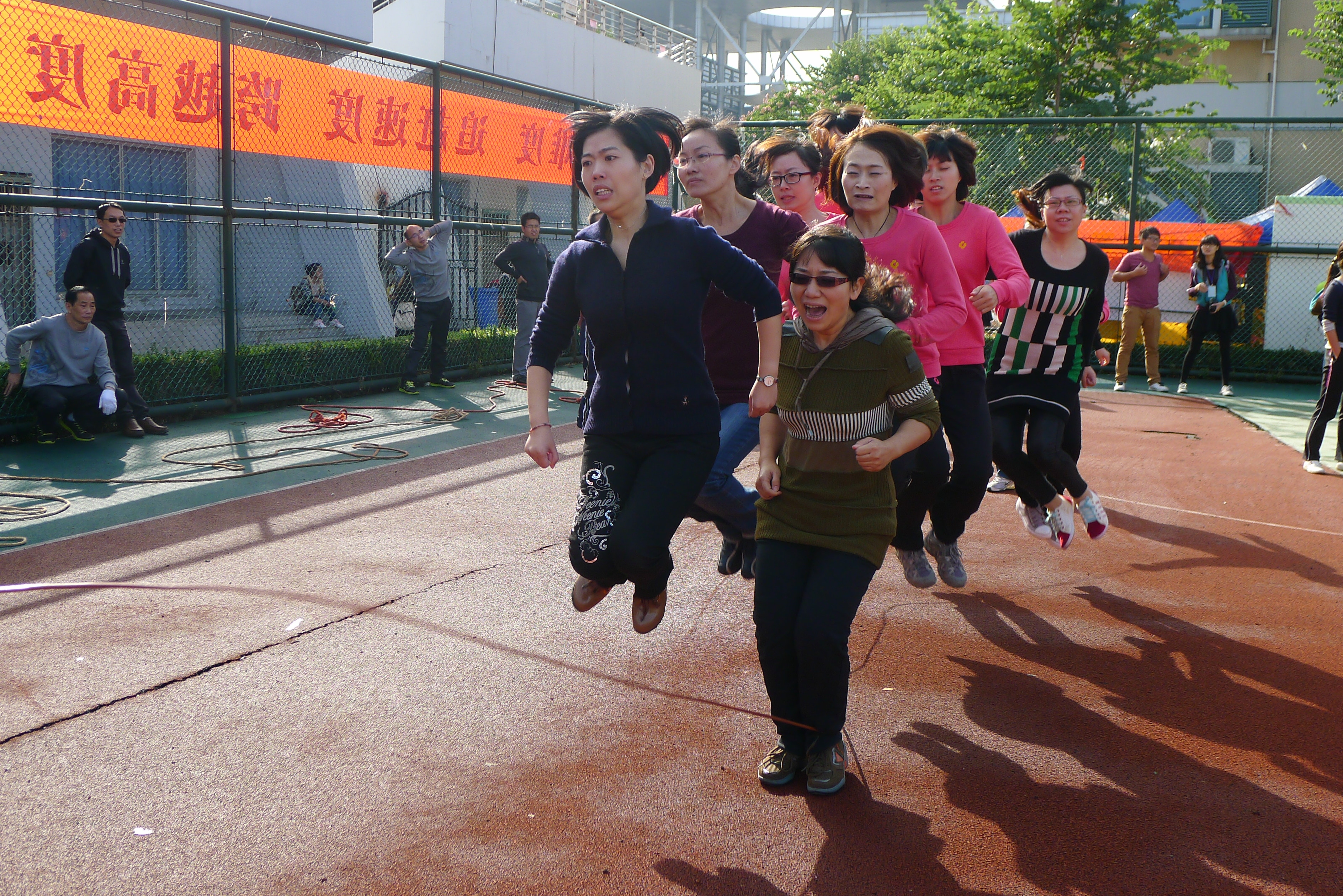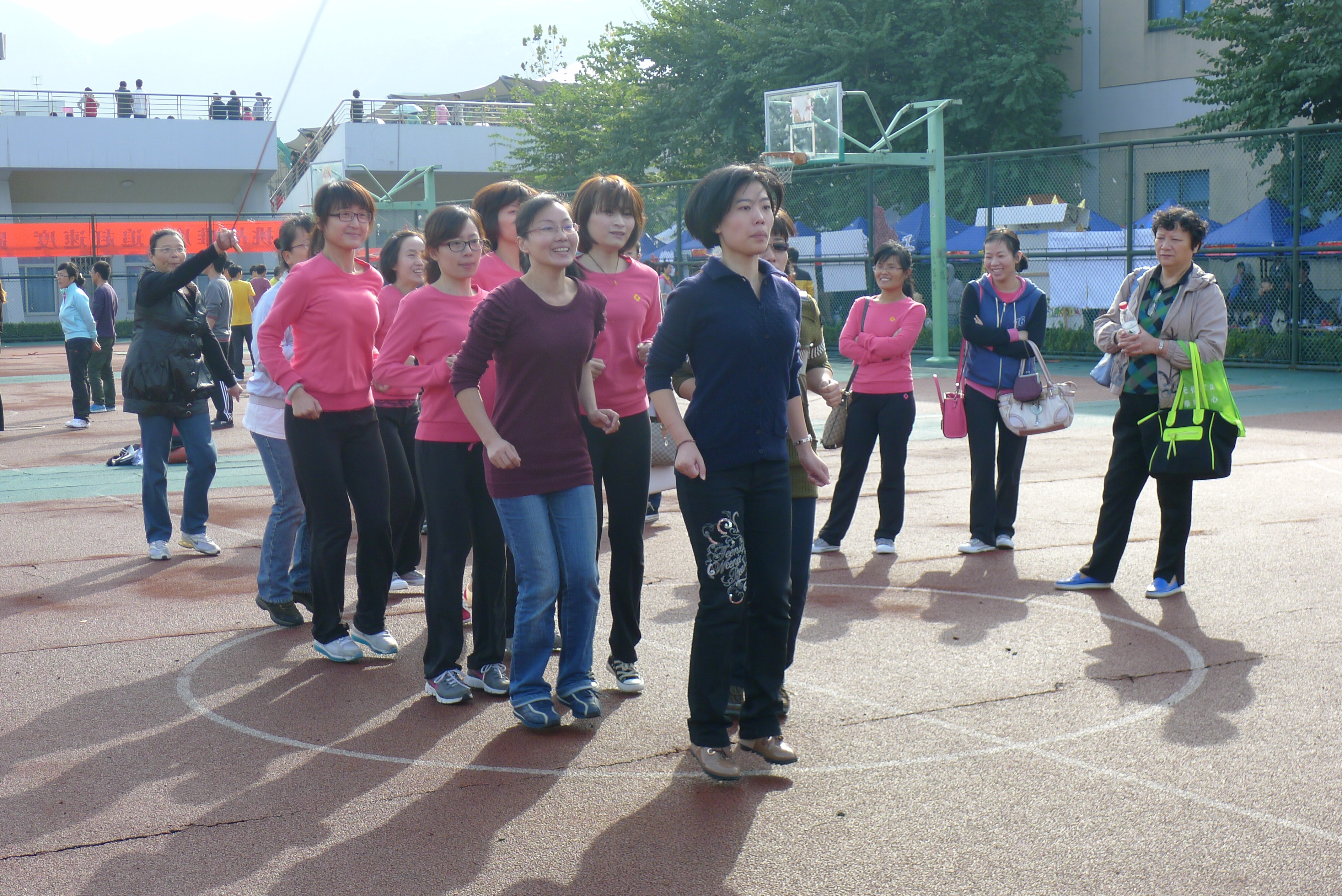 白云悠悠,秋风徐来,田径场后的篮球场上,一条条长绳不停地在舞动,海角社区 的女老师化身成女将,积极备战。