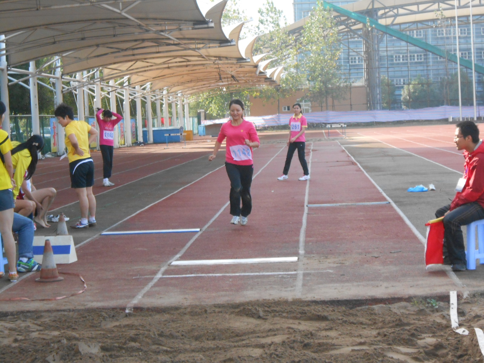 11月11号上午9点,在跳远场上,代表海角社区 参赛的吴东方老师带着笑容轻松上阵。站在起跑的地点,深吸一口气,承载着老师和同学的希望,用力向前跑,奋力一跳,轻盈地落在了沙坑里,这样反复努力。