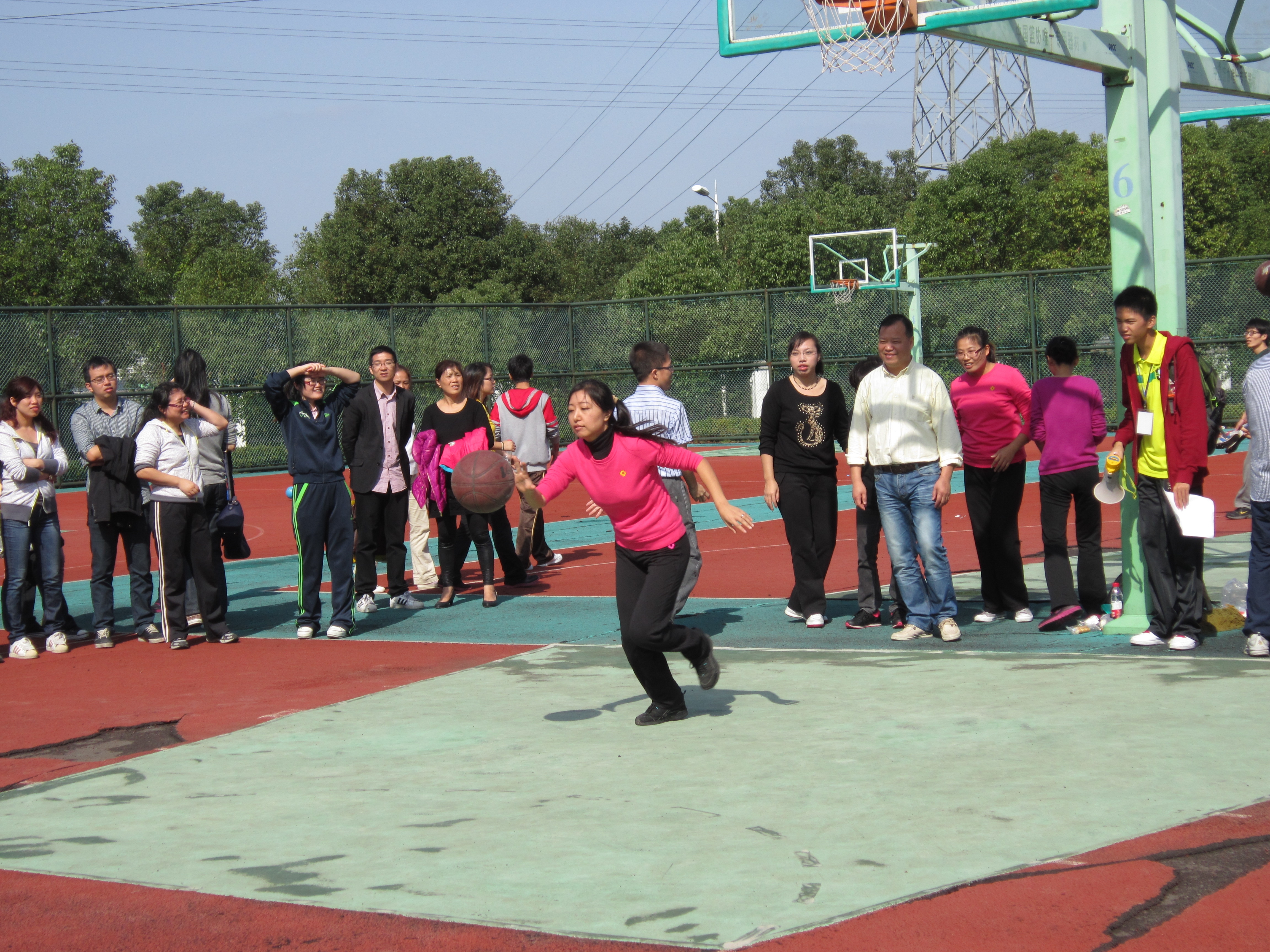 2012年11月11日上午10点,海角社区 参加投篮比赛的老师们早已准备就绪,跃跃欲试。随着裁判员一声令下,参赛老师们运着球,迅速向着篮筐奔去。投篮运球比赛需要的不仅仅是个人的速度,更需要的事整个团队的合作。尽管老师们的速度不是最快的,但是他们的合作十分默契,前一位老师刚刚出发,下一位老师便立即站到起始处,紧张地等待着传球。整个过程异彩纷呈,进行得紧张而有序,每一个进球都引来阵阵掌声和欢呼。