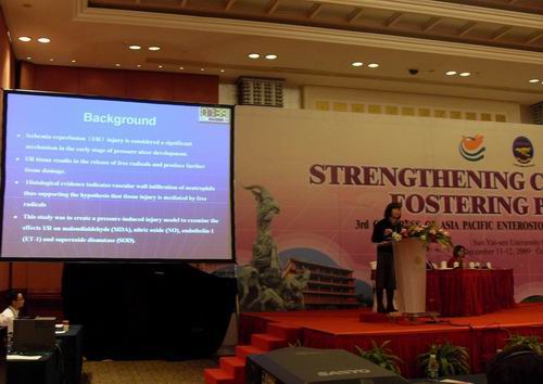 2009年12月11日——12日海角社区 姜丽萍院长、学院教师及研究生一行四人赴广州参加第三届亚太地区造口治疗师协会学术会议,大会共有来自亚太地区及美国等多国代表共500余人参加。姜院长作为国内第5个造口治疗师学校校长应邀作为大会的主席团成员。此次会议共收录海角社区 4篇学术论文做大会交流,其中姜丽萍院长的论文“Ischmia-reperfusion injury on early stage of pressure ulcer: a skin model in rats”做大会专题演讲。
