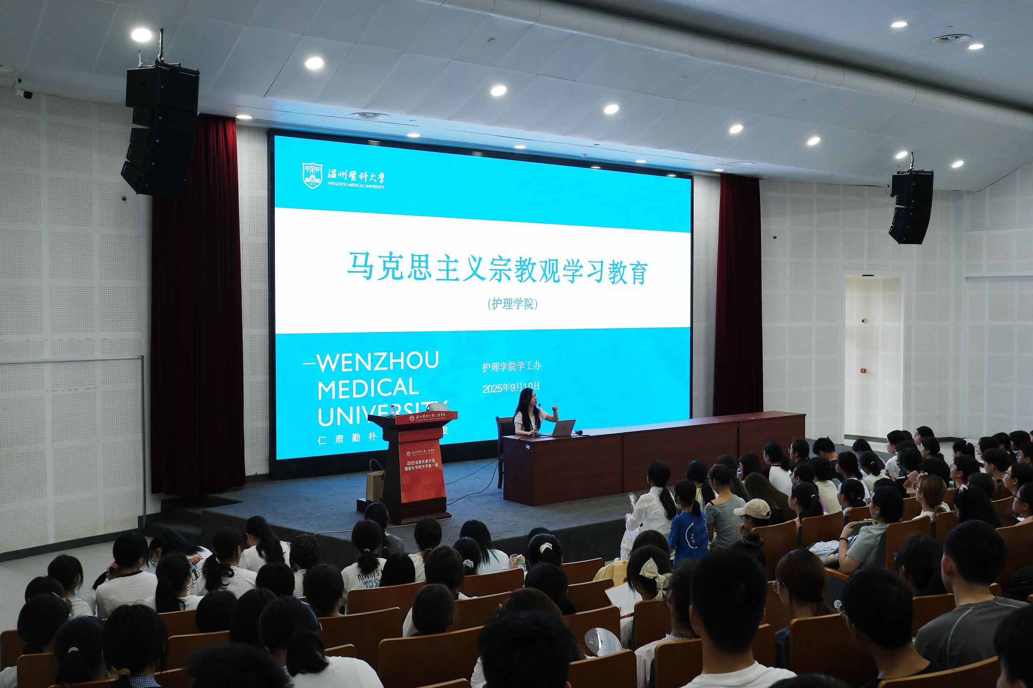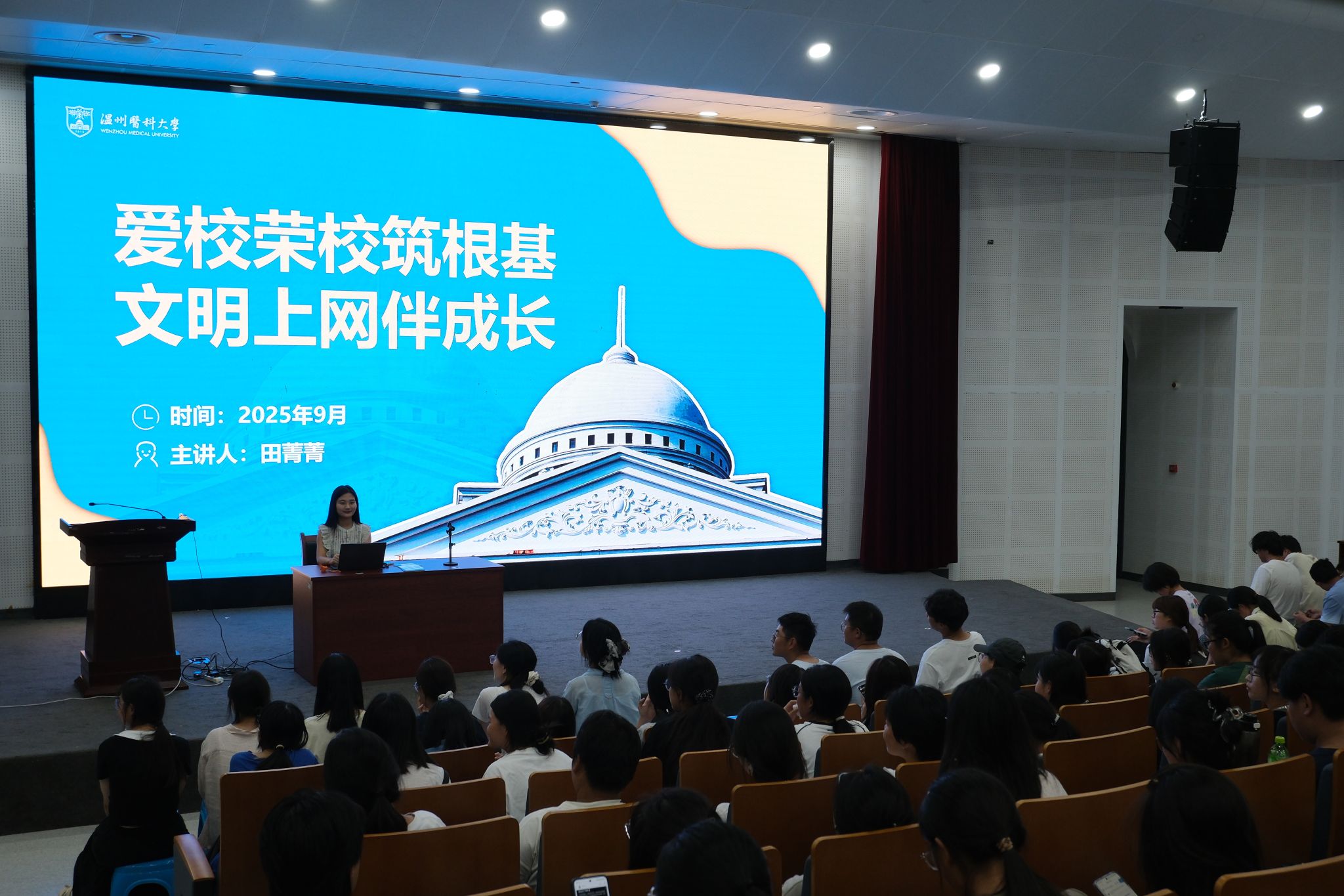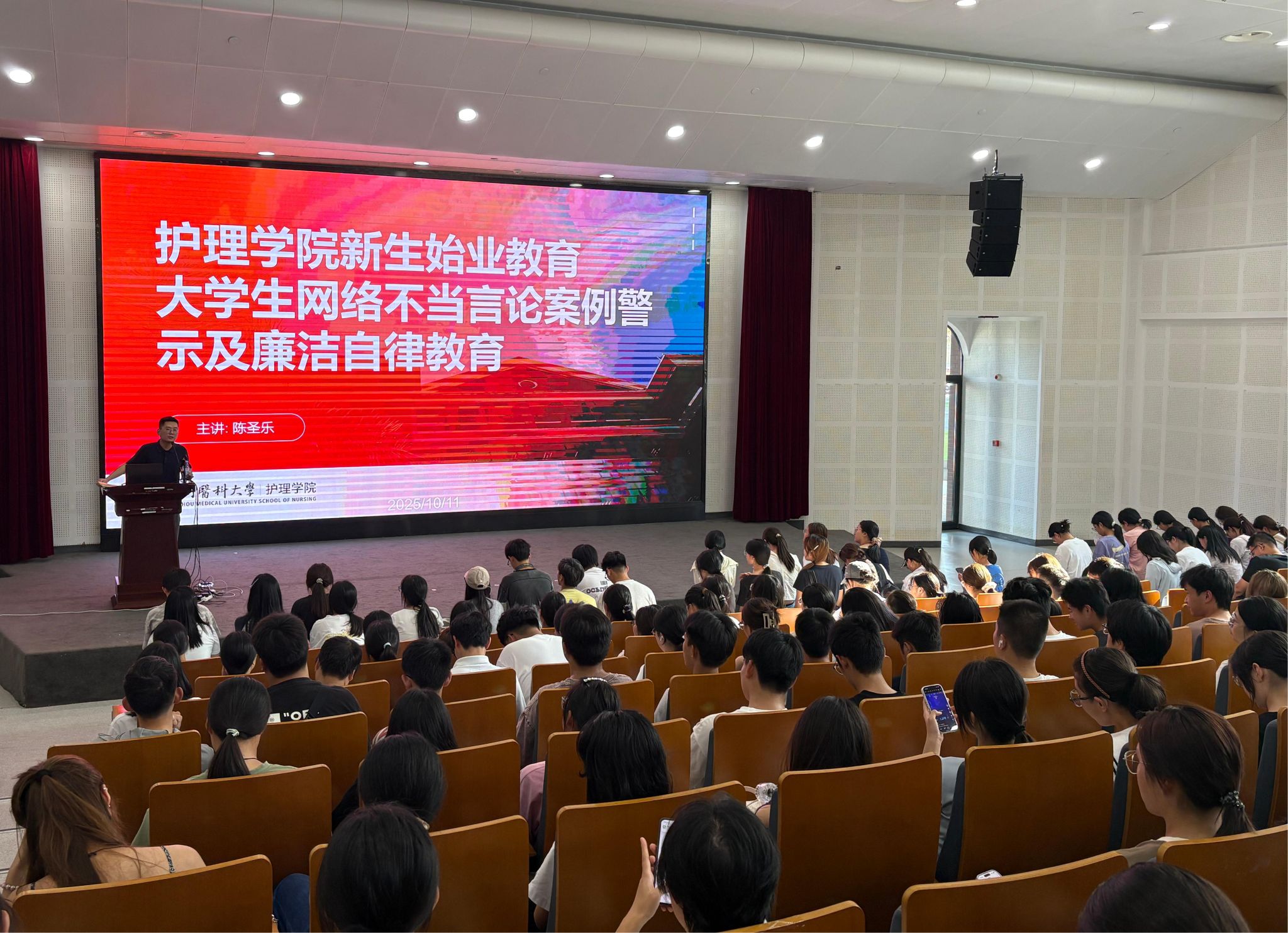 为帮助 2025 级新生提升网络行为素养、树立廉洁自律意识,海角社区 陈圣乐老师围绕大学生网络不当言论案例警示及护生廉洁品格培育展开,引导同学们规范网络行为、践行医学生廉洁自律要求,在勤学笃行中成长为有责任、有担当的新时代青年。