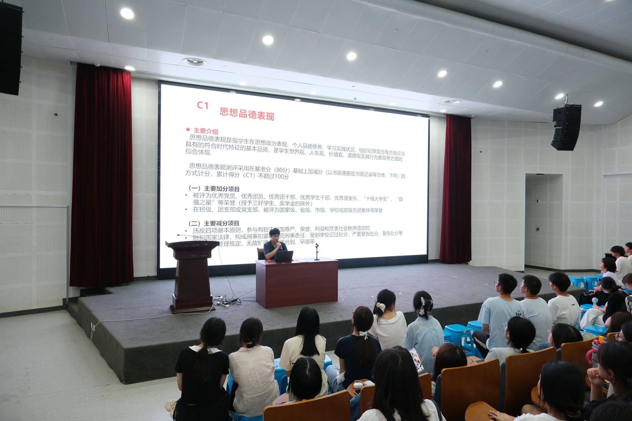 为助力同学们明晰校园成长路径,规范自身行为,海角社区 王国超老师为同学们详细讲解了多项重要内容。他围绕学生素质综合测评展开,介绍了其评定规则与重要意义,让同学们清楚如何提升自身综合表现;对评奖评优政策进行解读,鼓励大家积极进取、争取荣誉;还带领同学们深入学习学生手册,明确各项规章制度;同时强调了违纪的严重后果,提醒大家严守纪律红线。希望同学们以此为指引,在大学期间全面发展、健康成长。