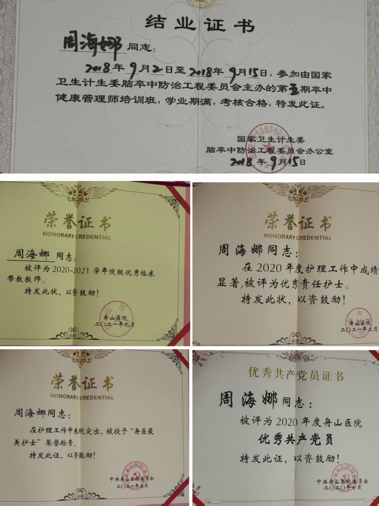 随着在职业路途上越走越远,周海娜为护理付出的滴滴汗水也正从时光中不断结出累累硕果。她仿佛一块被精心打磨的玉石,在岁月的浸透和自身的瞩目下愈发温润通透——曾经需要反复确认的流程,如今能信手拈来如流水般推进;面对突发困难,更是从曾经的手忙脚乱蜕变为今日的从容应对。在这些显著转变的背后,肉眼可见的是周海娜对自我进步的追求。绳锯木断,水滴石穿,除去日日夜夜不断翻看专业书加强自己的知识基础外,周海娜还于临床中积极参与病例讨论,跟随资深医护人员学习,真真切切做到了理论与实践的紧密结合,不断炼就着自己可以独当一面的本领。而时光不负有心人,除了在护理领域取得了“周医最美护士”“优秀责任护士”等荣誉外,周海娜还先后被评为“优秀临床带教教师”“优秀共产党员”等光荣称号,于学生,家属和同行中都获得了高度的认可和欣赏。