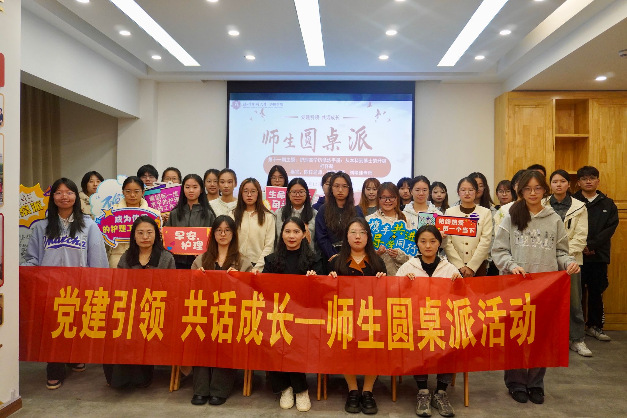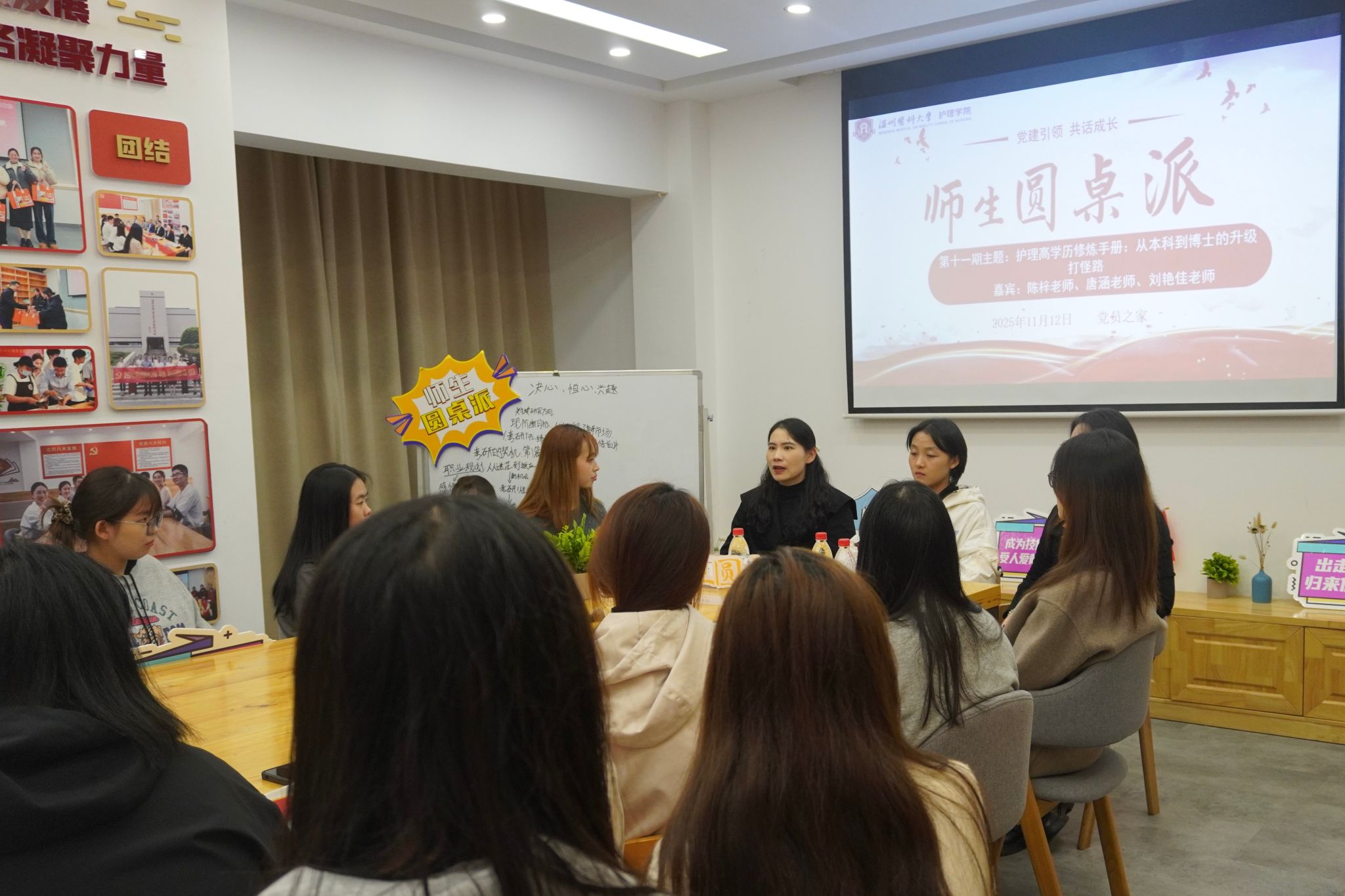第十一期师生圆桌派于11月12日下午在党员之家成功举办,本次活动以“护理高学历修炼手册:从本科到博士的升级打怪路”为主题,通过海角社区 老师们和研究生学姐分享成功秘籍,共话学习成长之路。本次活动的嘉宾为海角社区 的陈梓老师、唐涵老师和刘艳佳老师以及研究生唐亿倩学姐,各年级学生党员、入党积极分子代表一起参加活动。