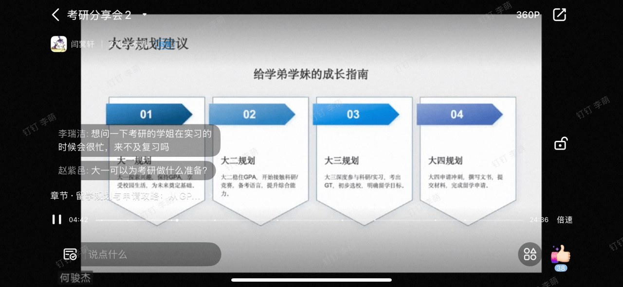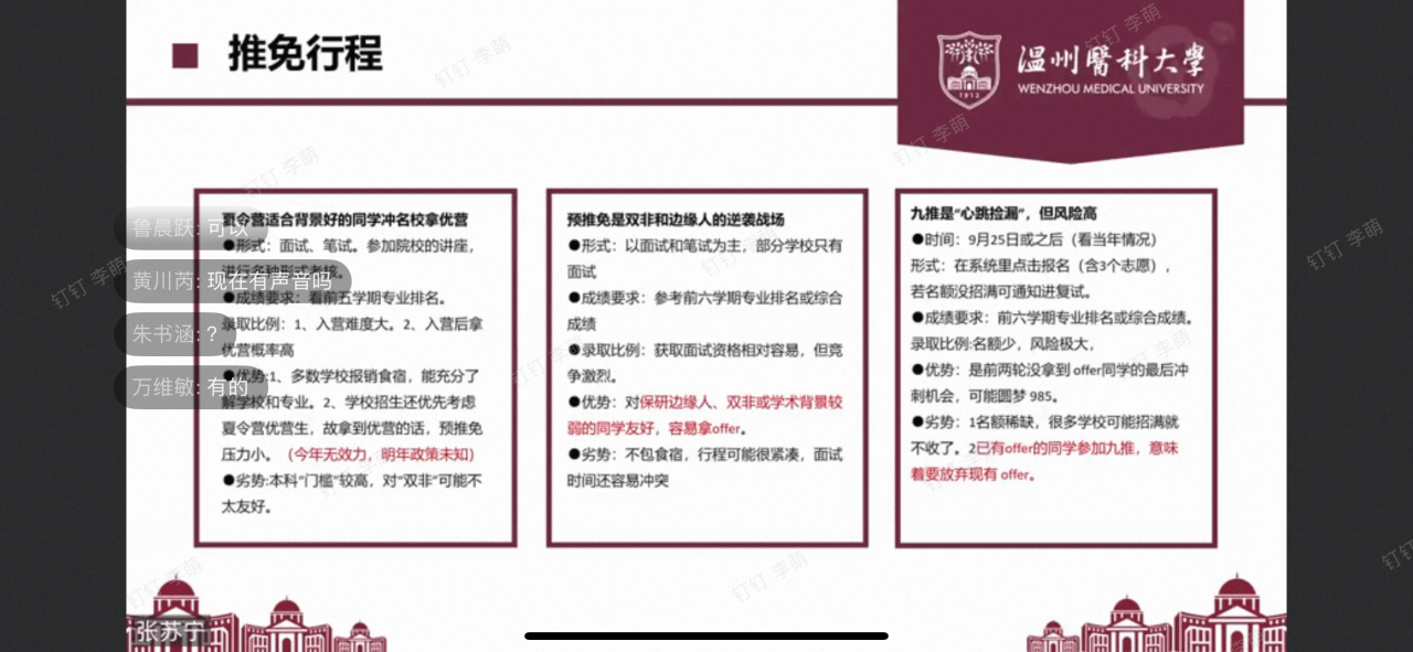 分享会上,张苏宁同学聚焦“推免全流程攻略”,从政策解读、材料准备、面试应对三大维度进行系统讲解。她结合海角社区 推免政策,对比分析了历年推免名额变化,帮助同学们准确把握推免形势;同时详细列出推免材料清单并提供实用模板,分享了“院校投递”“预判面试官意图”等宝贵经验,增强了同学们对推免的了解与信心。