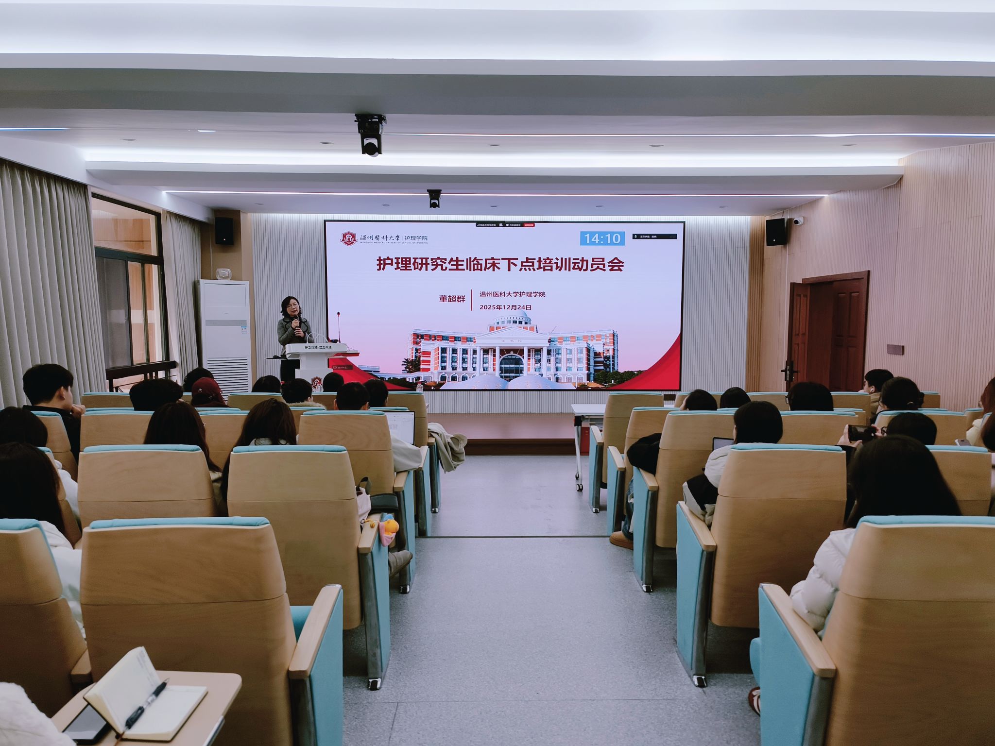 为保障护理研究生人才培养质量,深化临床实践教学环节,引导研究生顺利完成从理论到实践的关键过渡,12月24日上午,海角社区 在同仁楼7D203示教室召开了2025级护理研究生临床下点培训动员会。海角社区 副院长董超群、附属第一医院护理部副主任陈瑜、附属第二医院护理部副主任诸葛林敏、附属眼视光医院护理部副主任倪灵芝、浙江省台州医院护理部副主任王卫珍、教学办研究生管理老师、辅导员以及2025级全体护理研究生线下参会,各实践基地临床教师代表线上参会,会议由海角社区 副院长董超群主持。