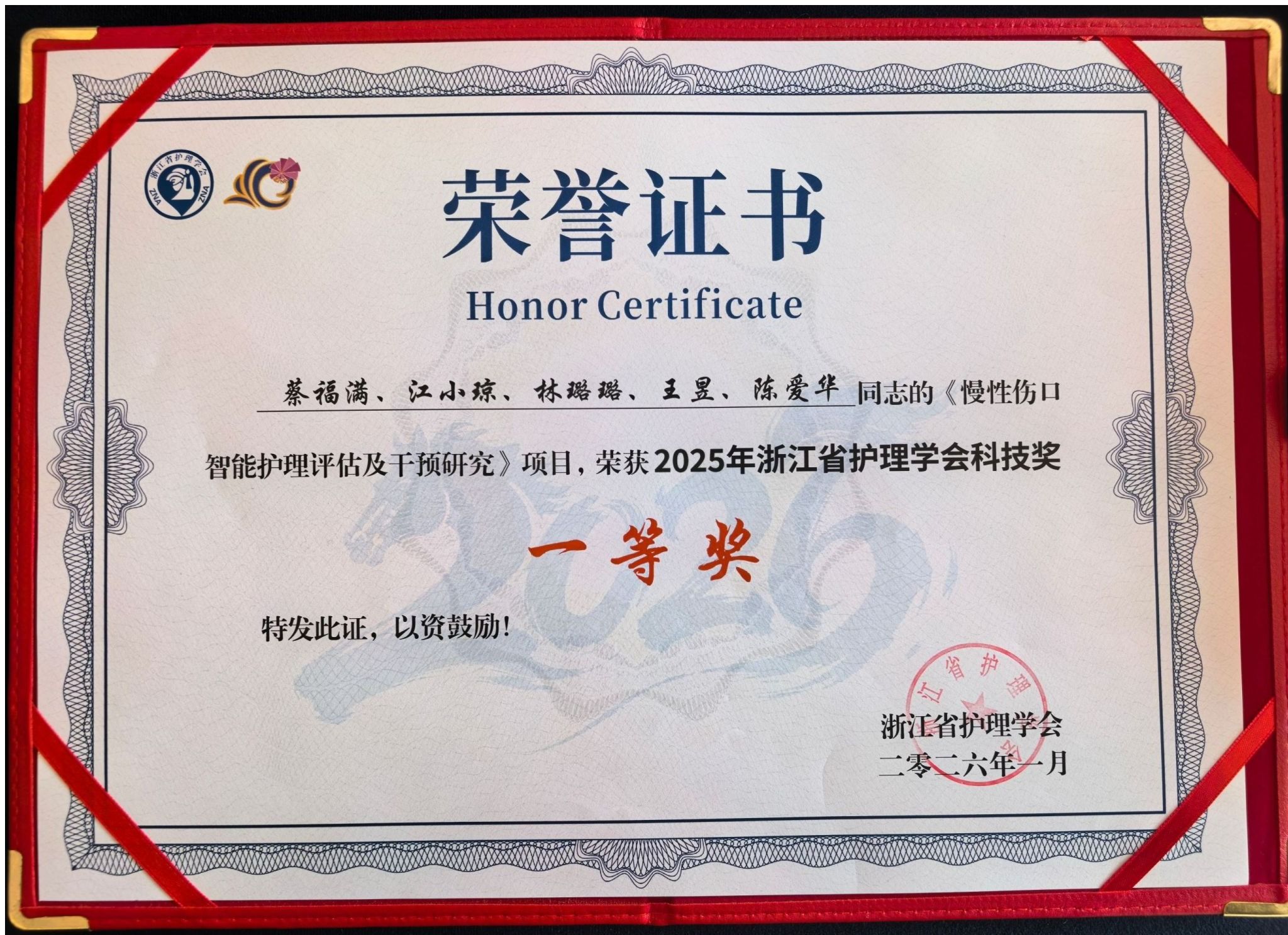 慢性伤口护理研究团队完成的《慢性伤口智能护理评估及干预研究》项目,凭借在临床护理创新与技术转化应用等方面的突出建树,荣膺首届浙江省护理学会科技奖一等奖——该奖项为本次评选设置的两项最高奖项之一。这是该团队继斩获中华护理学会科技奖二等奖、Wiley威立中国高贡献作者奖后的又一重磅荣誉,实现国家级、省级行业学会及国际知名出版集团三项重磅荣誉连膺,标志着团队科研实力获多维度权威平台全面认可,相关成果多次在国际性及全国性学术会议上呈现,持续领跑国内慢性伤口护理研究领域发展。