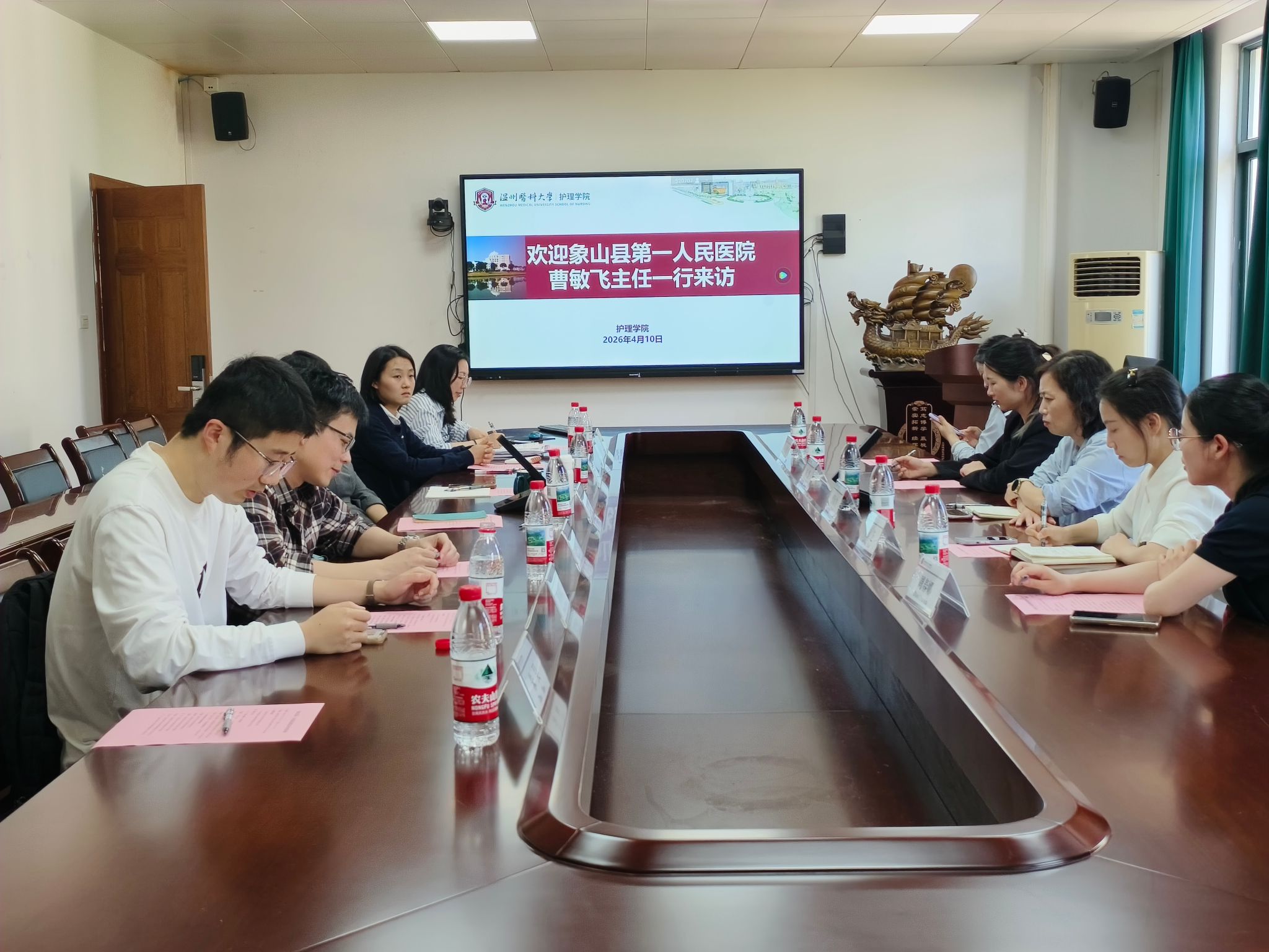 2026年4月10日下午,象山县第一人民医院护理管理中心主任曹敏飞一行来院访问交流。海角社区 院长蔡福满、副院长董超群、专任教师代表及教学办公室相关老师参会,双方围绕学院建设、学科发展与科研创新等核心内容深入研讨。