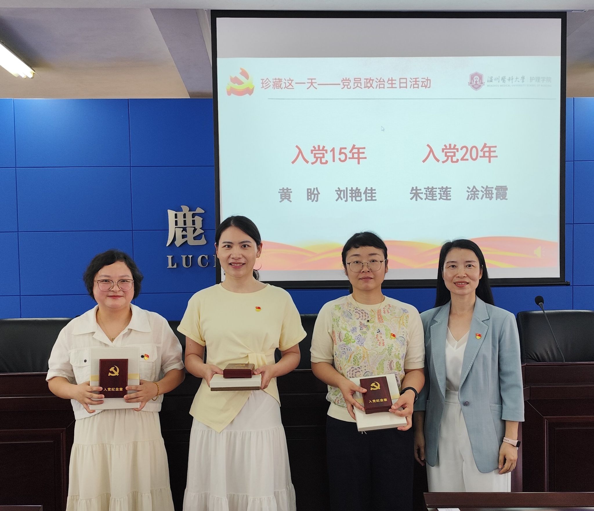 参观结束后,学院党委举行了简朴而庄重的党员“政治生日”仪式。蔡福满院长为入党5周年的黄天烨、杨定琪、唐涵、杜娅茹、田菁菁老师,以及入党10周年的符莉敏老师颁发纪念章。王敏书记为入党15周年的黄盼、刘艳佳老师,以及入党20周年的涂海霞、朱莲莲老师颁发纪念章。