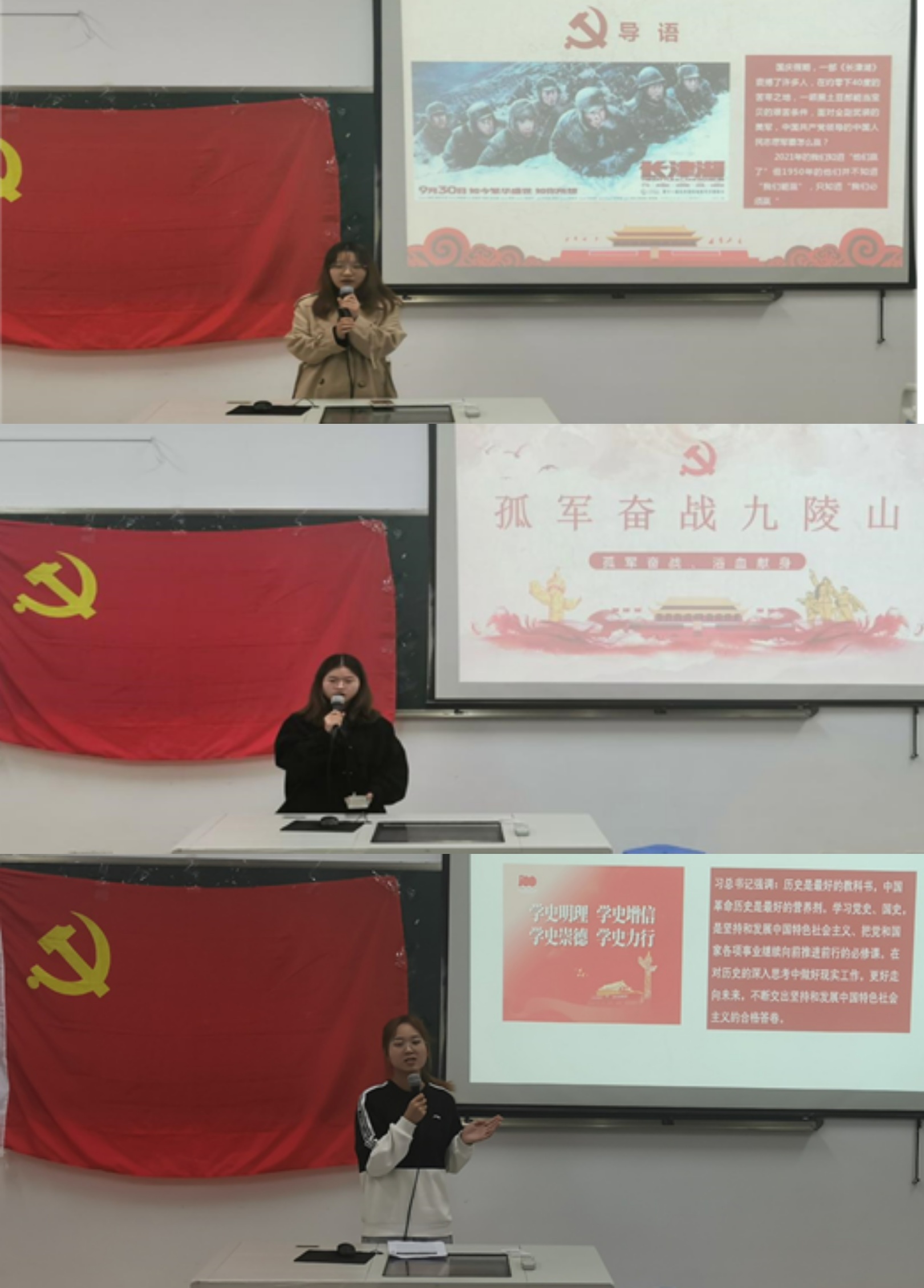 “冰血长津湖”、“孤军奋战九陵山”、“上甘岭战役”,王紫轩、王佳洁、董彦君同学带我们回到了那场中国人民志愿军跨国鸭绿江赴朝鲜前线,誓死保卫祖国边境的战役中。