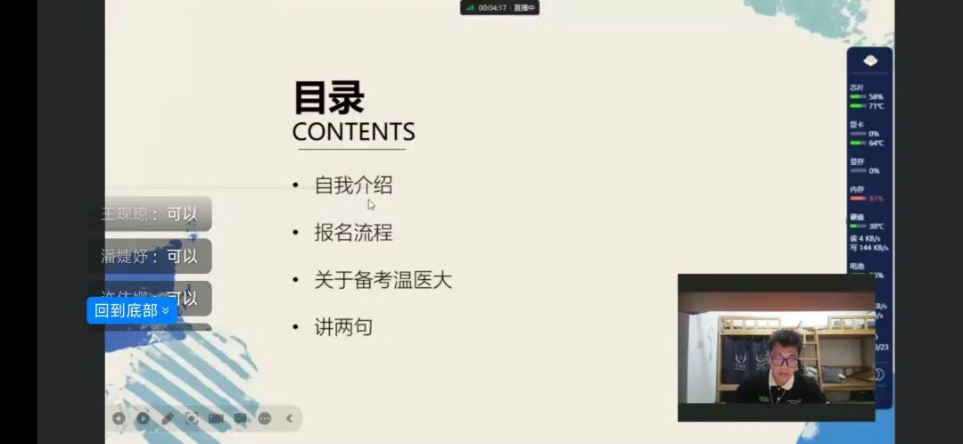 王婧学姐从如何处理实习和考研的关系出发,并介绍了报考流程,主要包括考生常见问题和填写报名信息应注意的问题。此外,学姐重点介绍了天津医科大学考研专业、招生和复习方法,并解答了同学们关心的跨考、就业方向和学校选择等方面的问题。最后,学姐还强调了临近考试要关注当地疫情政策,可以通过申请借考免去隔离带来的不便。