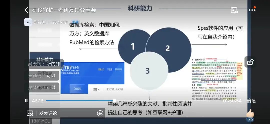 姚佳盈学姐主要从复试流程、复试内容和复试技巧三个方面入手,并对如何准备科研问题进行详细介绍。学姐还强调在复试过程中,如果遇到问题莫紧张、莫吐槽,积极找老师沟通,力求解决问题。此外,学姐还和同学们分享了自己收集的相关文献资料和阅读笔记。