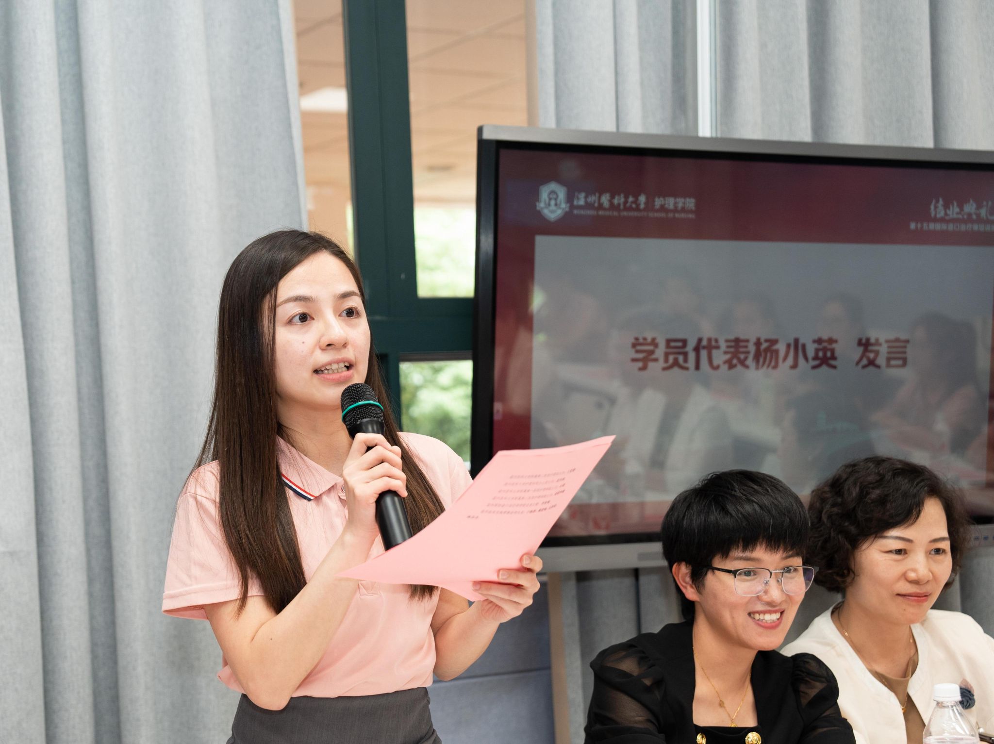 来自澳门的学员代表杨小英发言,对老师们的辛勤付出表示感谢,并表态将把学校所学到的知识和技能运用到实践中,为造口伤口专业的发展贡献力量