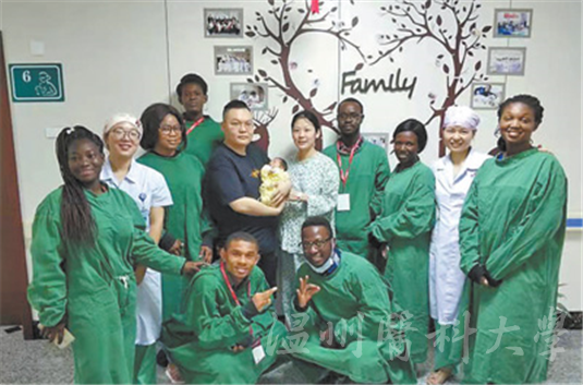 附属医院开展期间,非洲国家学员在产房参观时与中国妇产科医护人员及产妇家人留影。